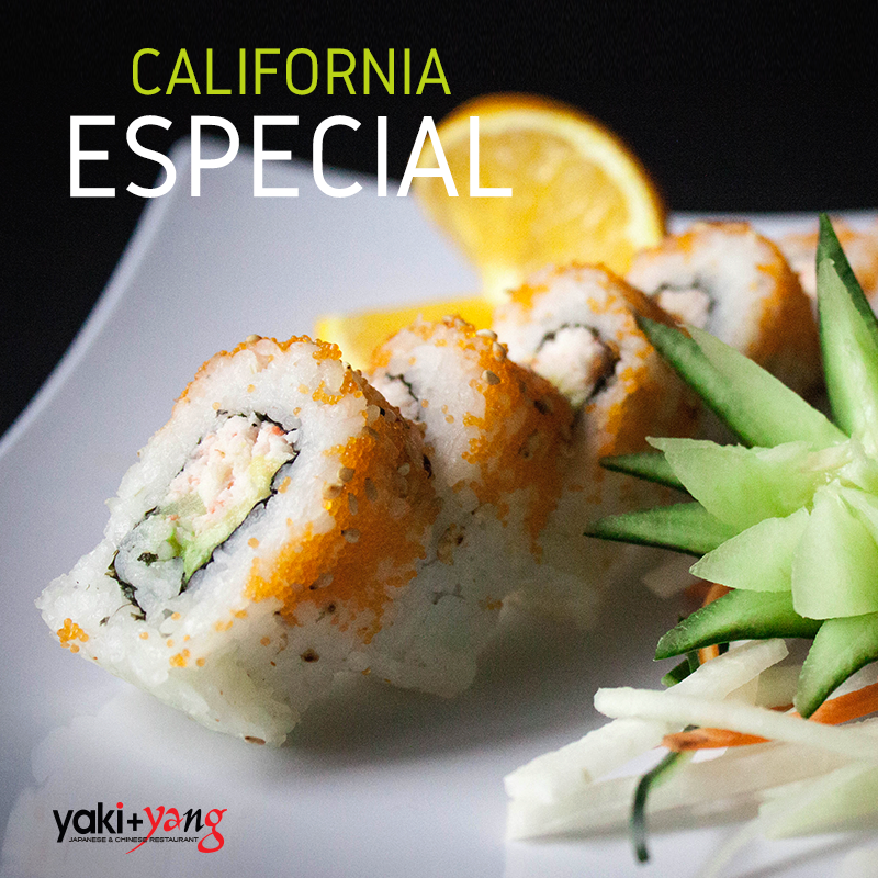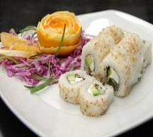 Cangrejo, pepino, aguacate por dentro, masago y ajonjolí por fuera.