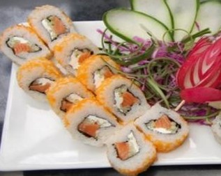 Salmón, tampico, philadelphia, pepino, aguacate y alga por fuera.