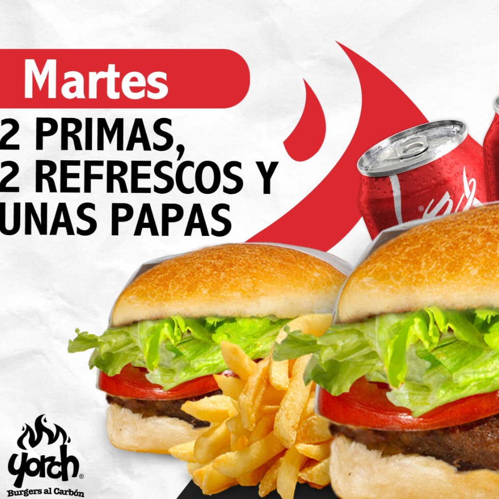 2 Prima Burguer con queso + 1 Papas a la Francesa + 2 Refrescos gratis