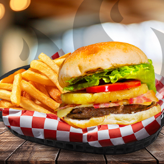 Carne fresca de res asada al carbón, queso cheddar blanco, piña asada, tocino ahumado doradito, jugoso tomate, lechuga fresca, mayonesa, catsup y mostaza y porcion de papas francesas (chicas).