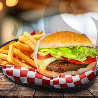 Deliciosa carne fresca de res asada al carbón, queso cheddar blanco, lechuga fresca, jugoso tomate, mayonesa, catsup y mostaza y porcion de papas francesas (chicas).