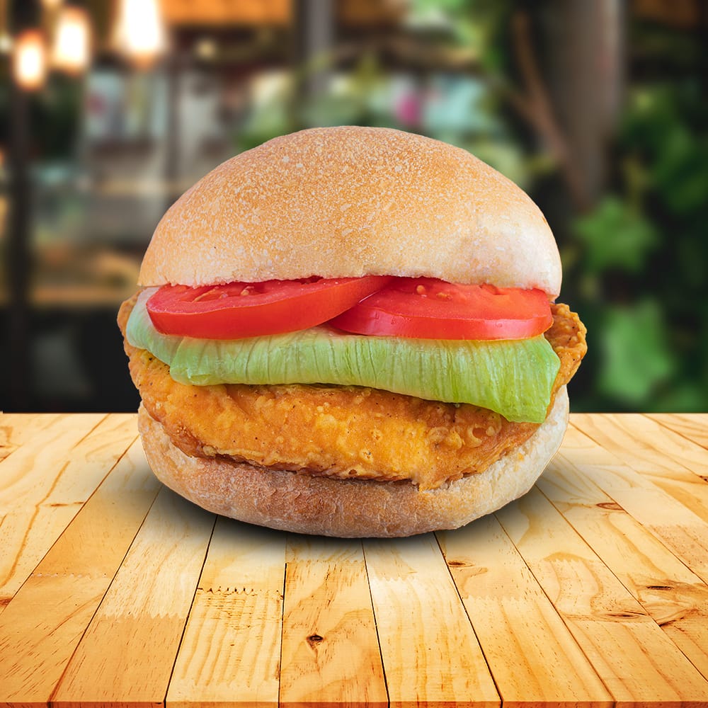Pechuga de pollo empanizada, lechuga fresca, tomate, mayonesa, catsup y mostaza,