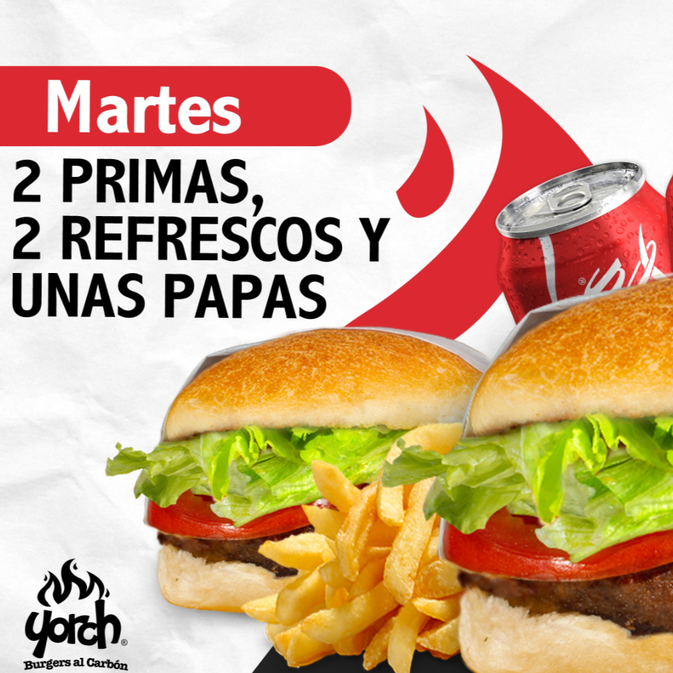 2 Prima Burguer con queso + 1 Papas a la Francesa + 2 Refrescos gratis