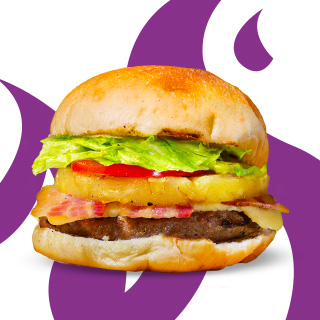 Carne fresca de res asada al carbón, queso cheddar blanco, piña asada, tocino ahumado doradito, jugoso tomate, lechuga fresca, mayonesa, catsup y mostaza, y porcion de papas francesas chicas gratis.