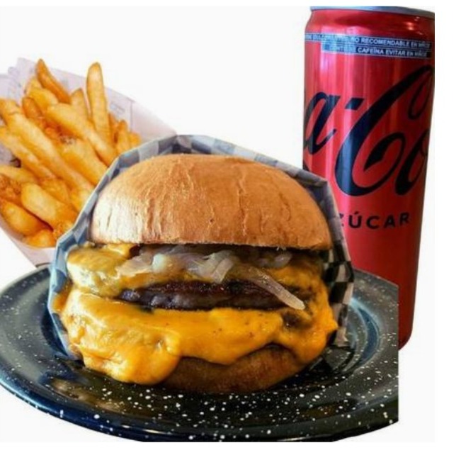Hamburguesa Doble con papas o aros de cebolla y Refresco