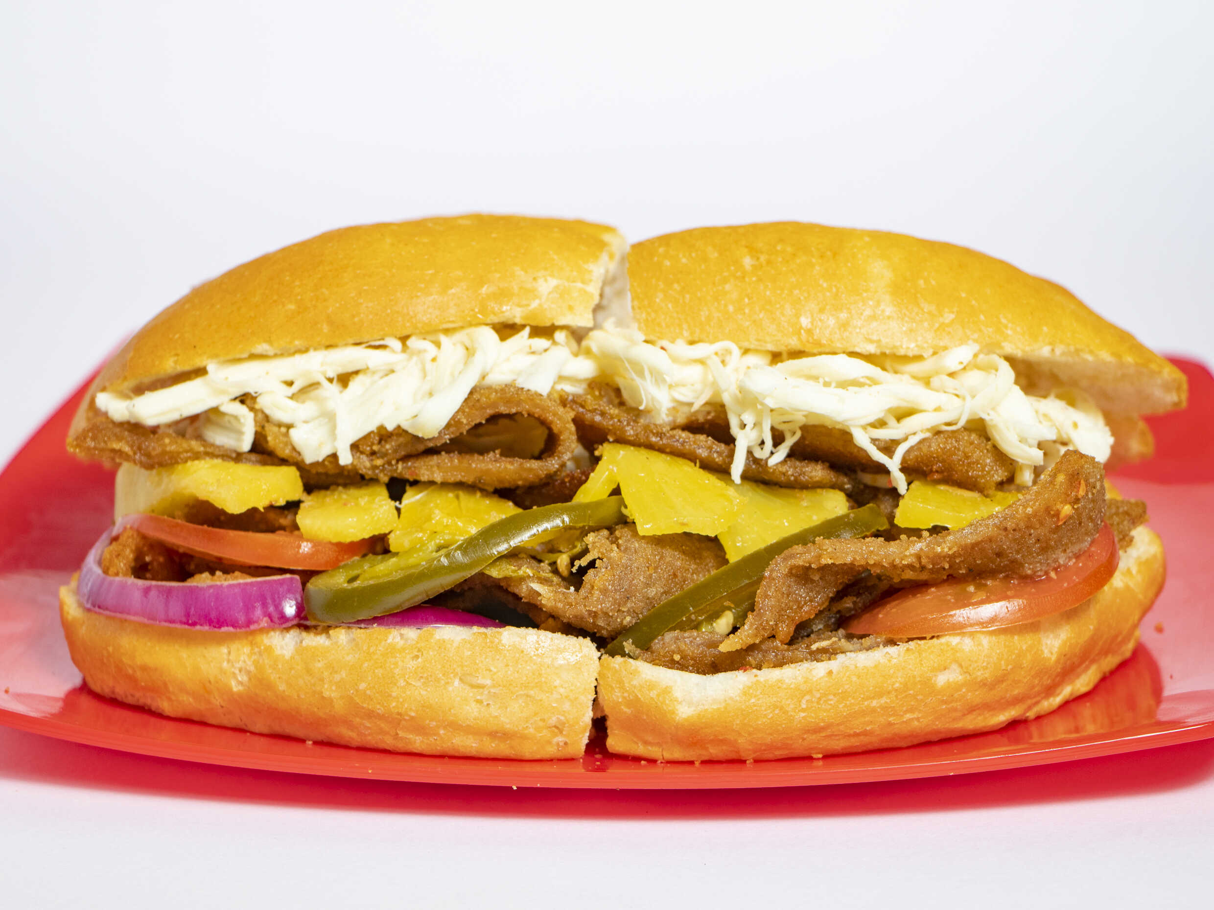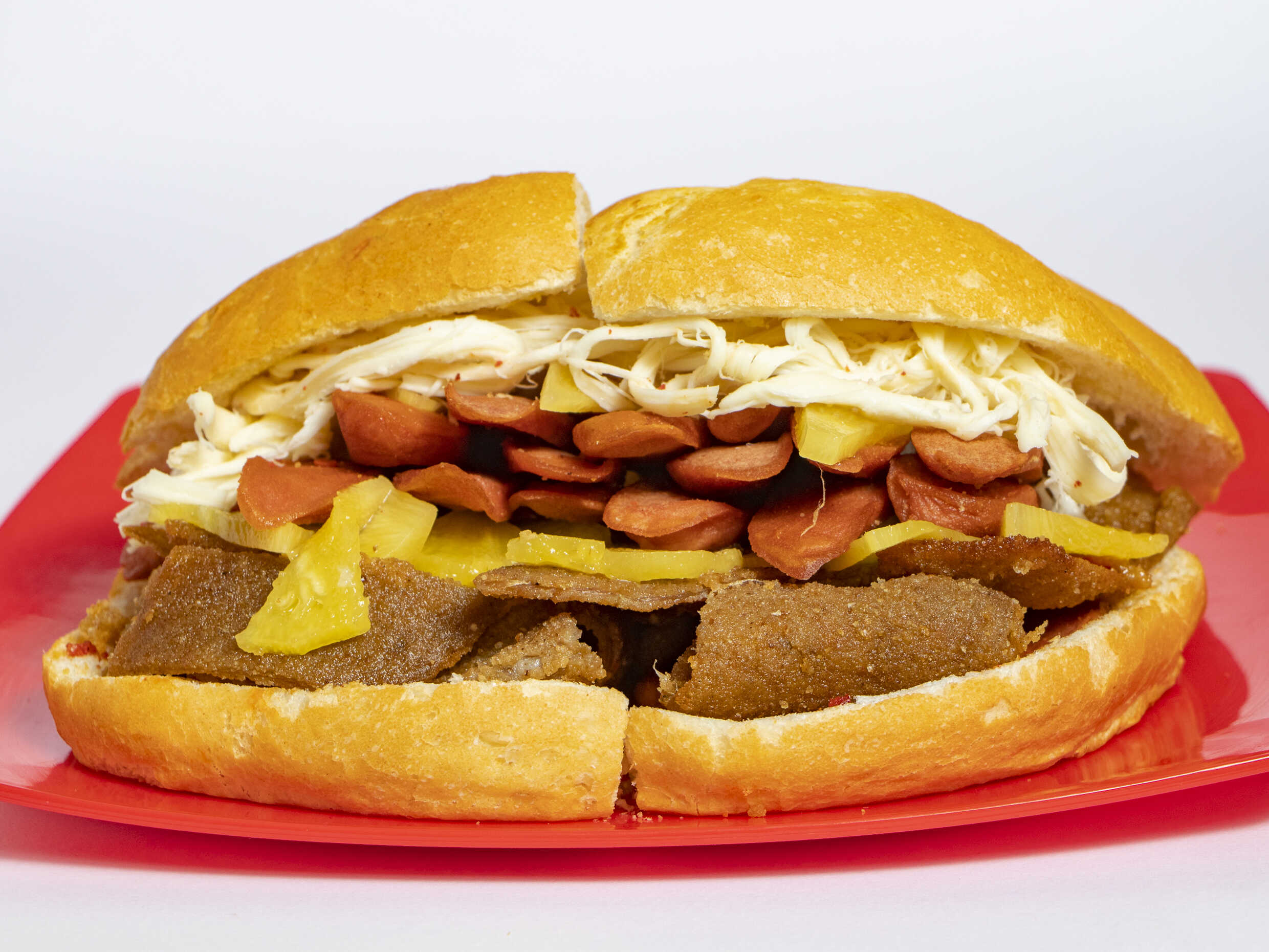 Milanesa, salchicha, piña y quesillo.