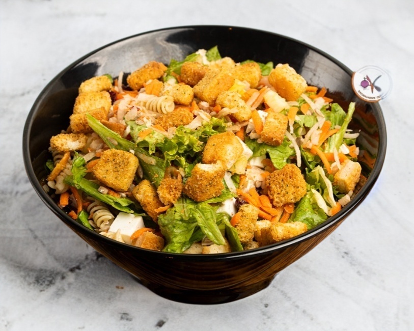 Trocitos de pollo crunchy, queso panela, pasta fusil, jícama, zanahoria, manzana, arándano, semilla de girasol y crutones con un toque de aceite de oliva.