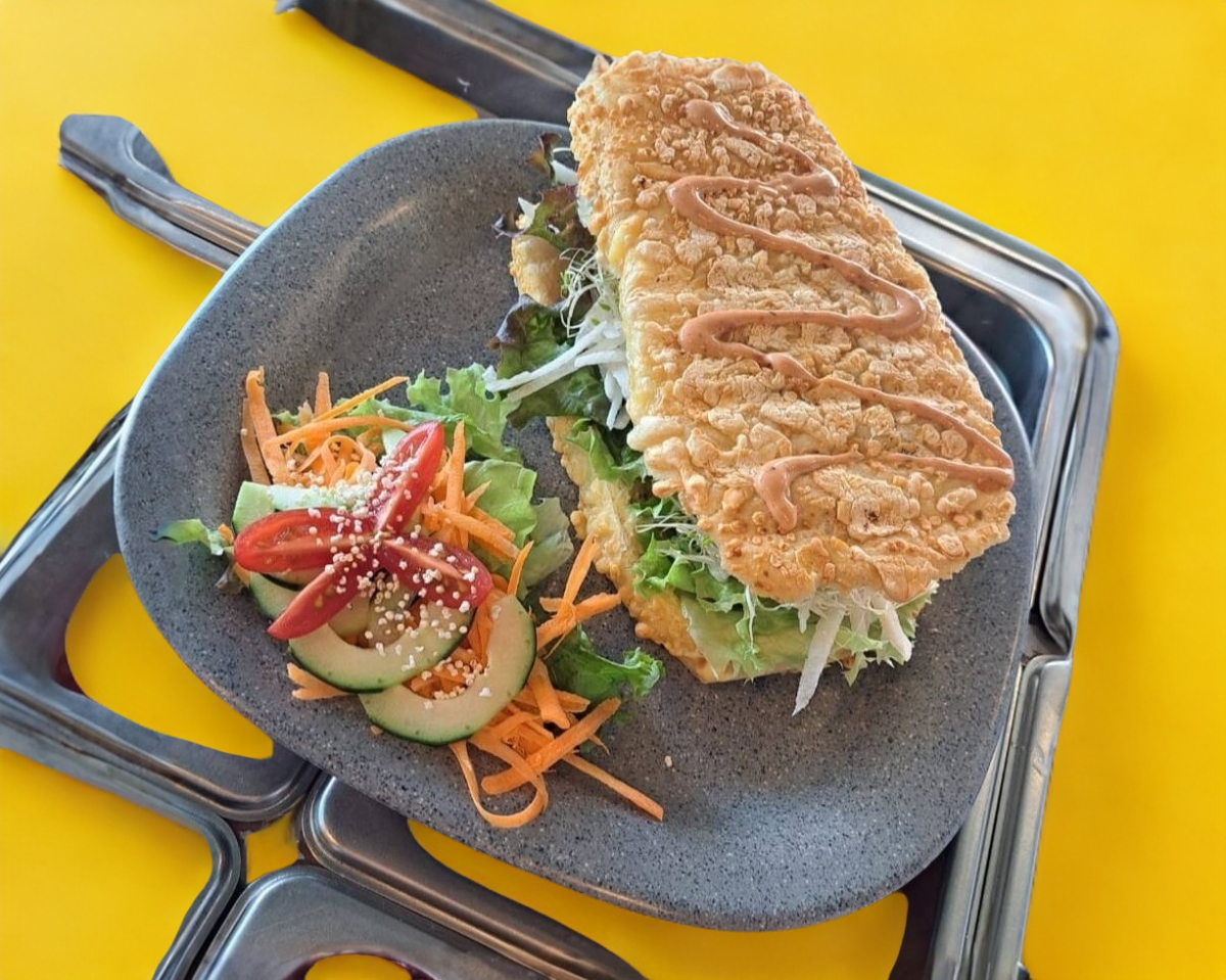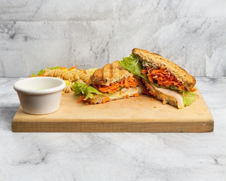 Pan de granos, pollo crunchy, queso gouda, germinado de alfalfa, jícama, lechuga y cebolla morada con aderezo de la casa ranch.