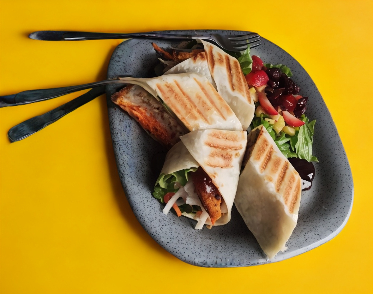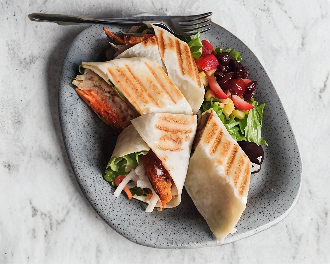 Tortilla de harina, pollo búfalo, queso gouda, jícama, zanahoria, pepino envuelto en una cama de lechuga.