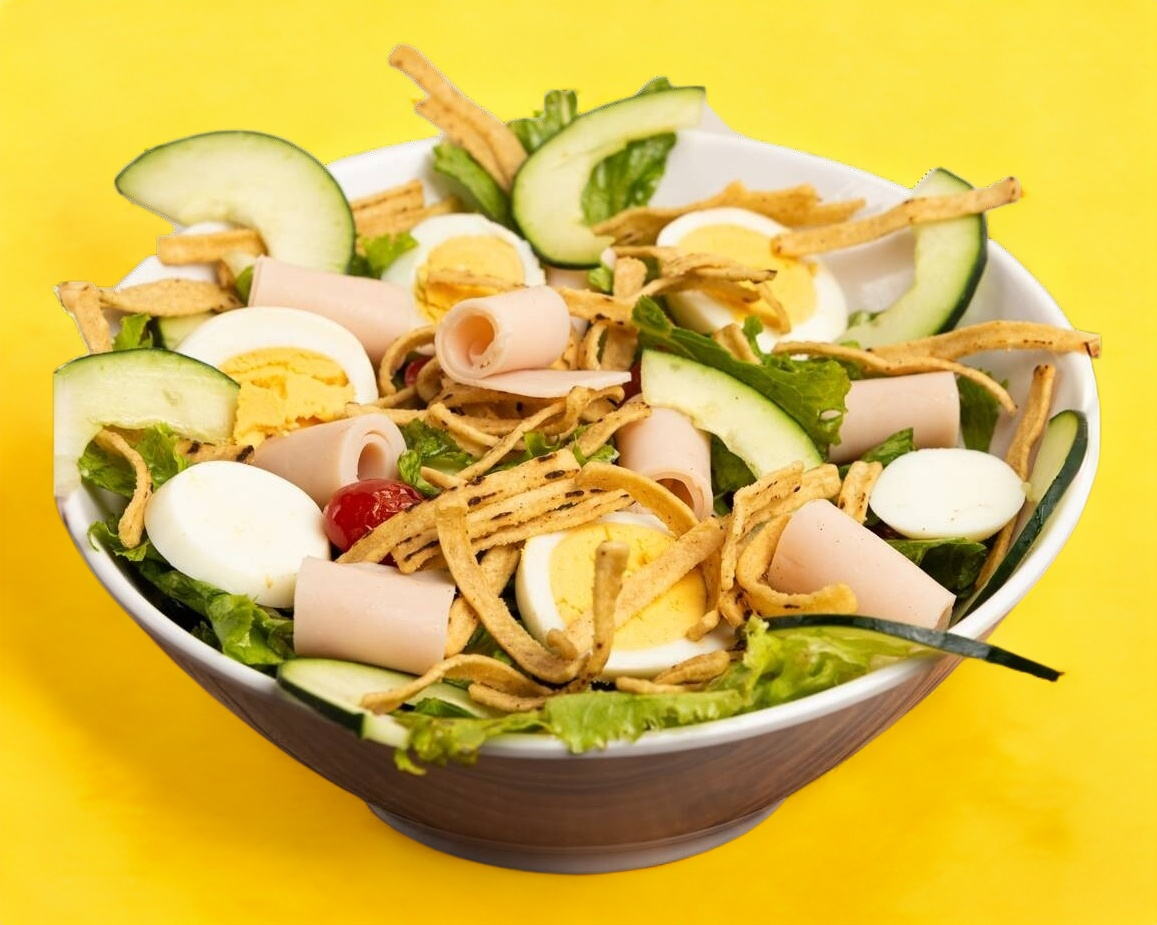 Pollo crunchy, queso gouda, jícama, zanahoria y jitomate envuelto en una cama de lechuga y un toque de queso crema.