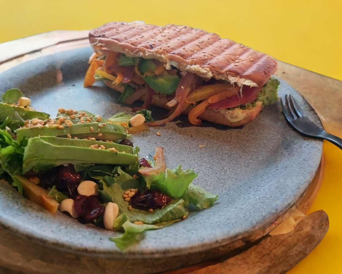 Delicioso pan de chapata integral, frijoles, queso gouda, jamón de pavo y pico de gallo.