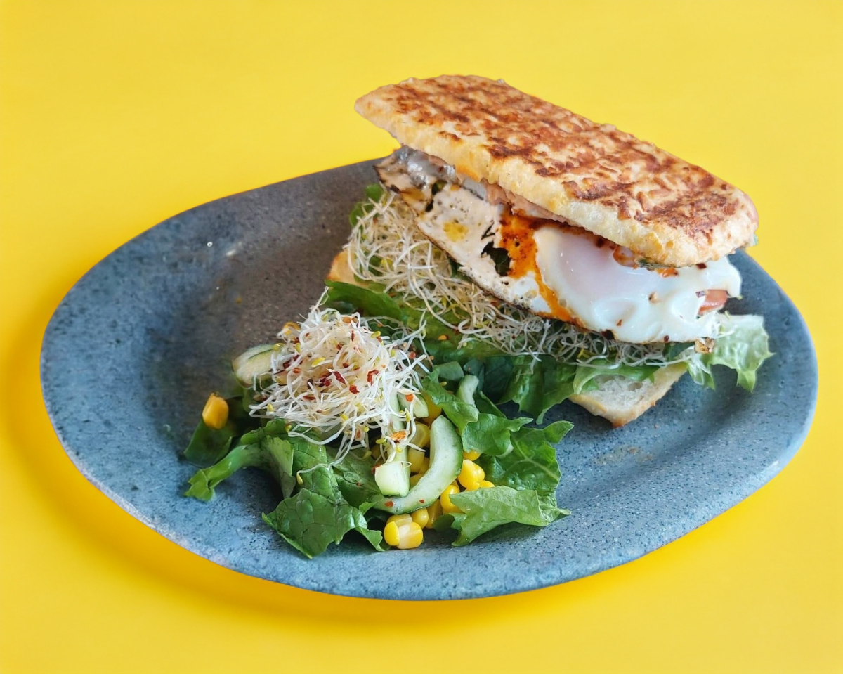 Pan aderezado con frijoles refritos, huevo estrellado, queso gouda, espinaca, jitomate, aguacate, germinado de alfalfa bañado con salsa macha.