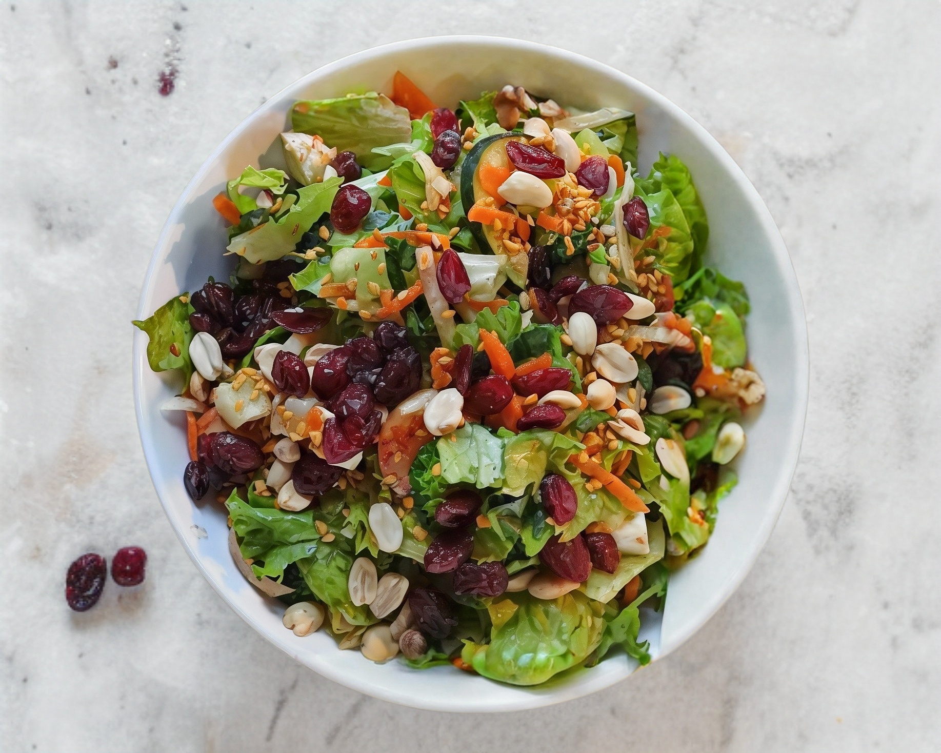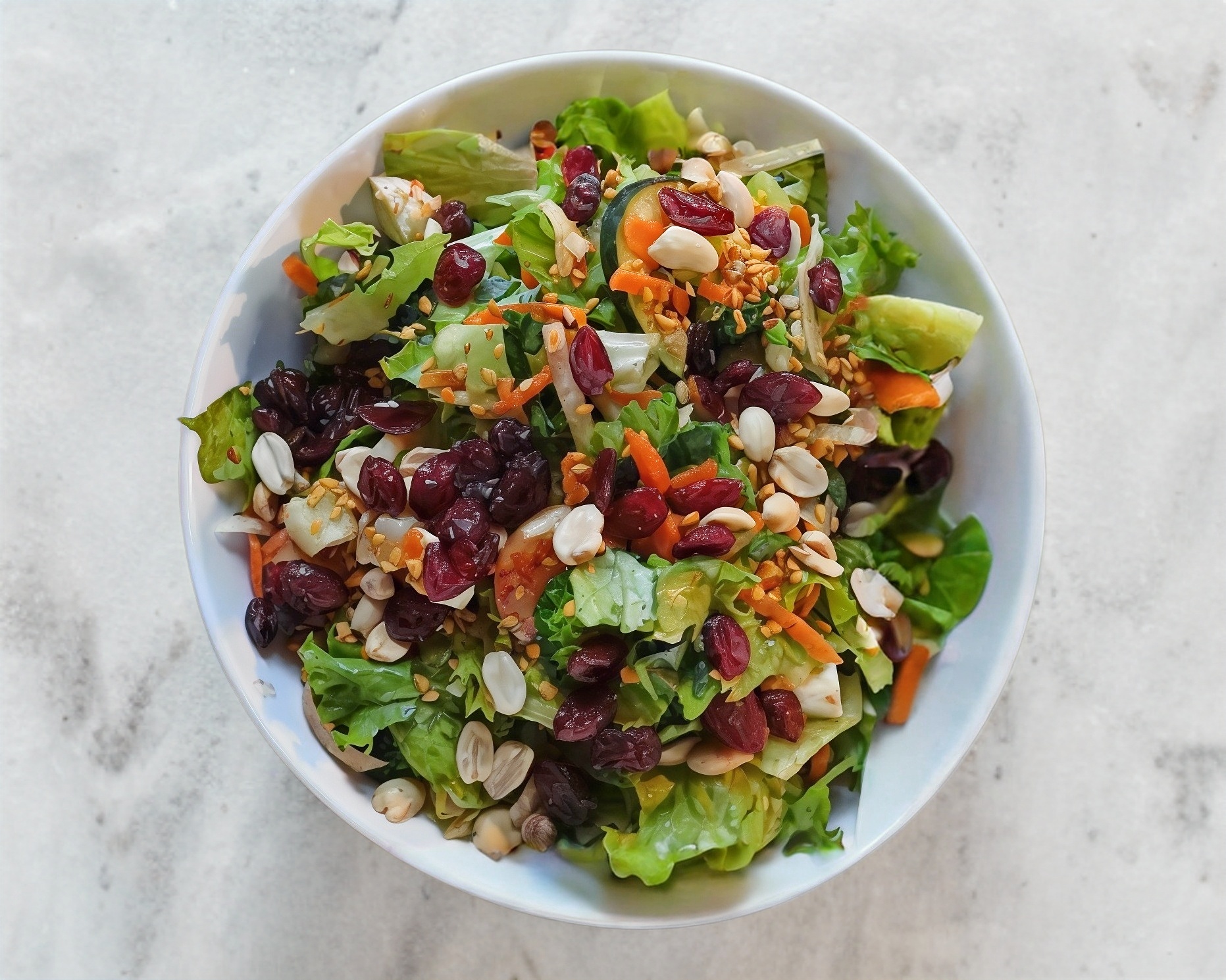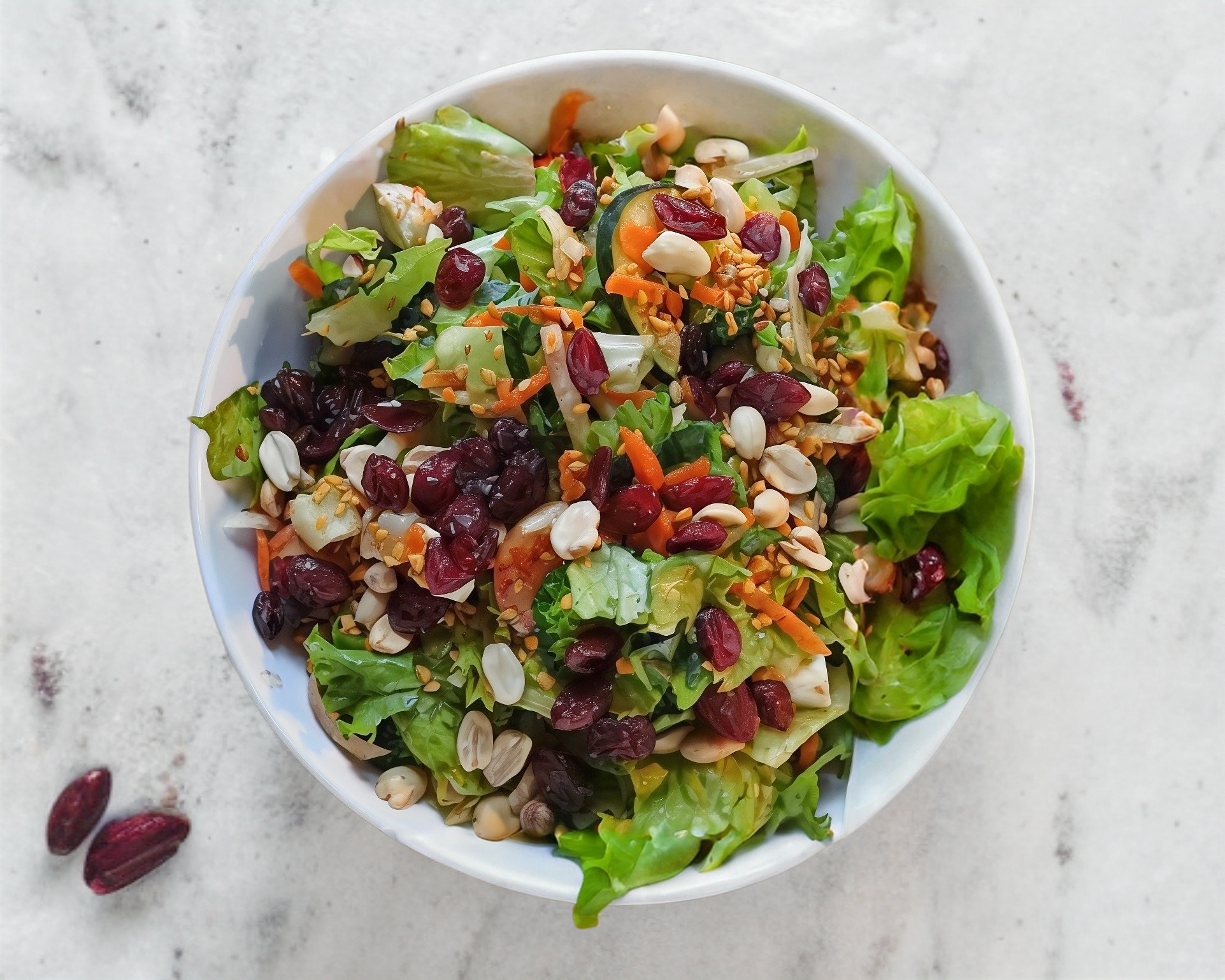 Cubitos de pollo asado, queso panela, pasta, elote, pepino, jícama, zanahoria, ajonjolí garpiñado, cacahuate, arándano y aderezo mango-habanero.