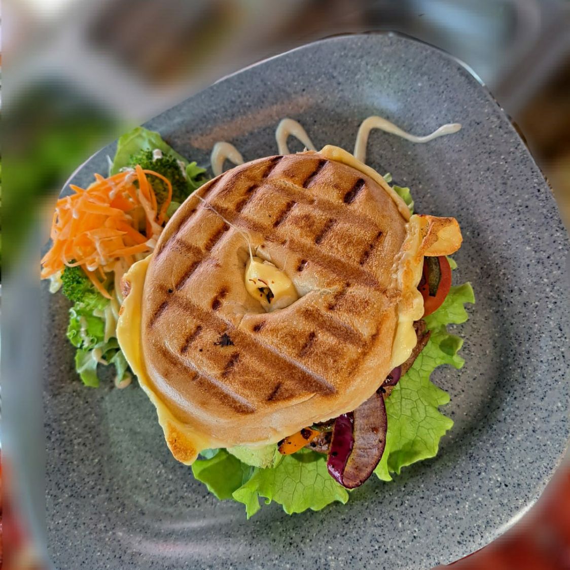 Atún, queso, manchego, espinaca, germinado de alfalfa, lechuga y rebanadas de aguacate aderezada con spicy chipotle.