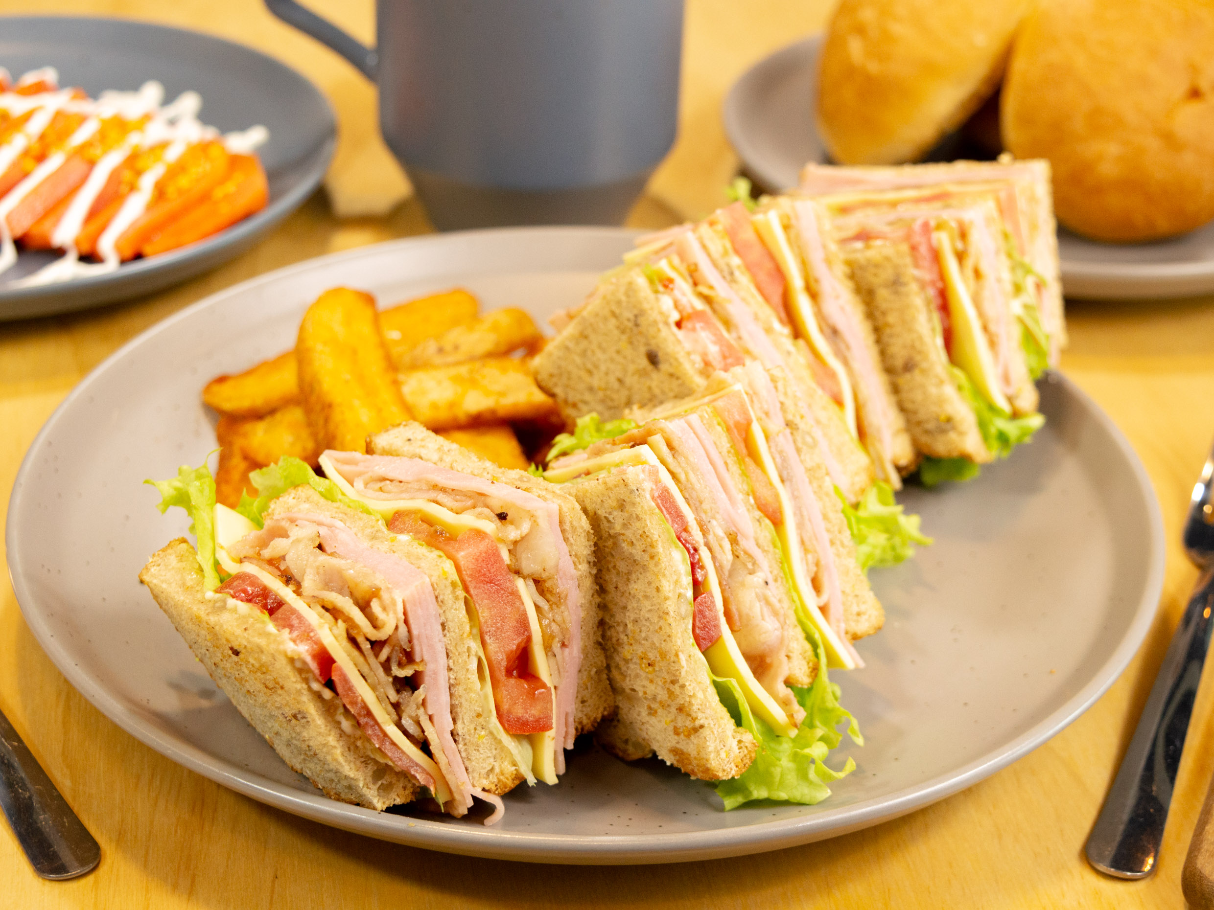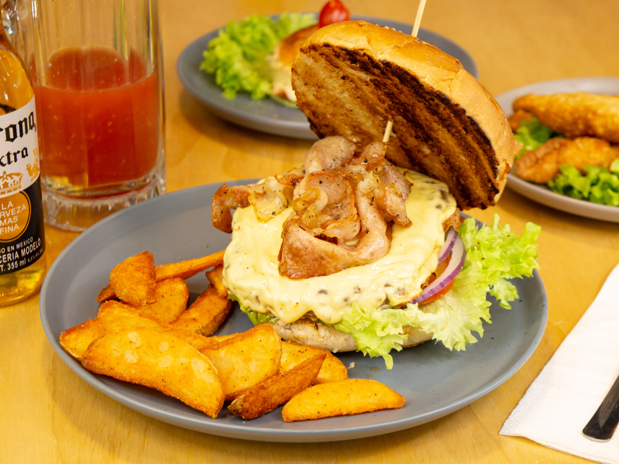 Tocino, queso y guacamole, elige pollo o res y papas a la francesa o gajo.
