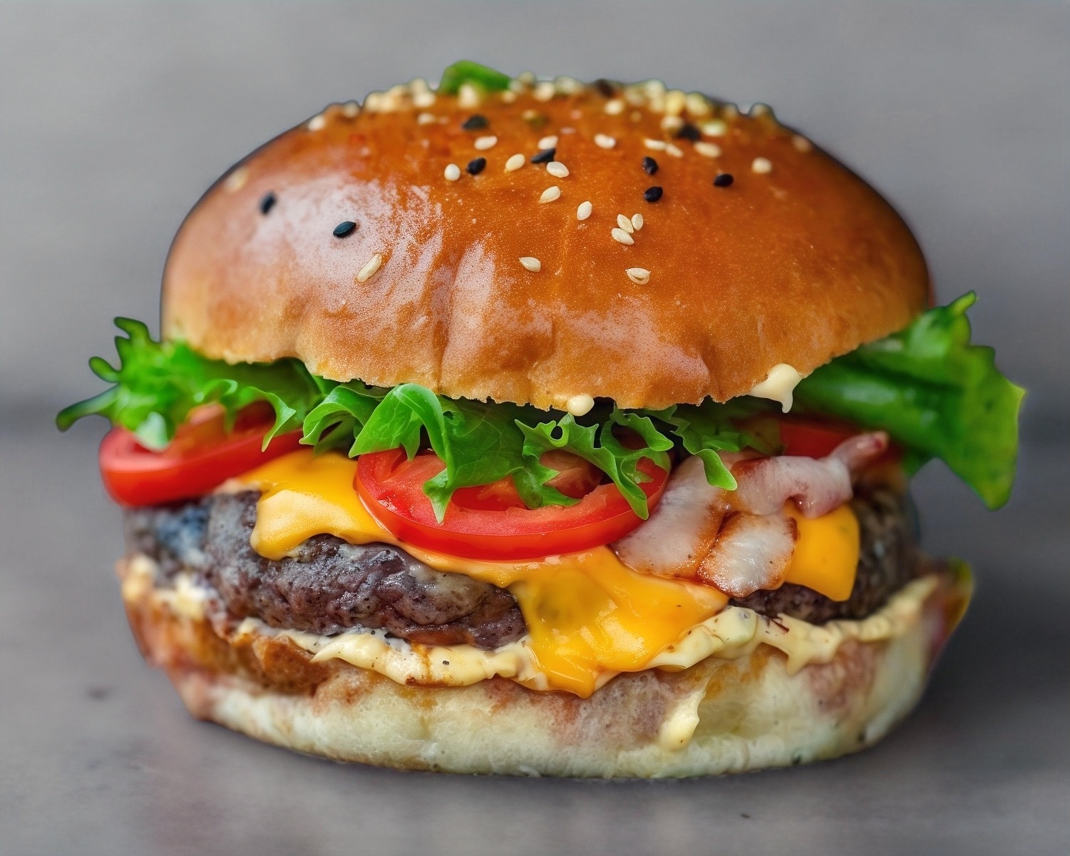 Carne de res casera, tocino, manchego, mayonesa, cátsup, mostaza, queso amarillo líquido, lechuga, jitomate, cebolla caramelizada, rajitas.