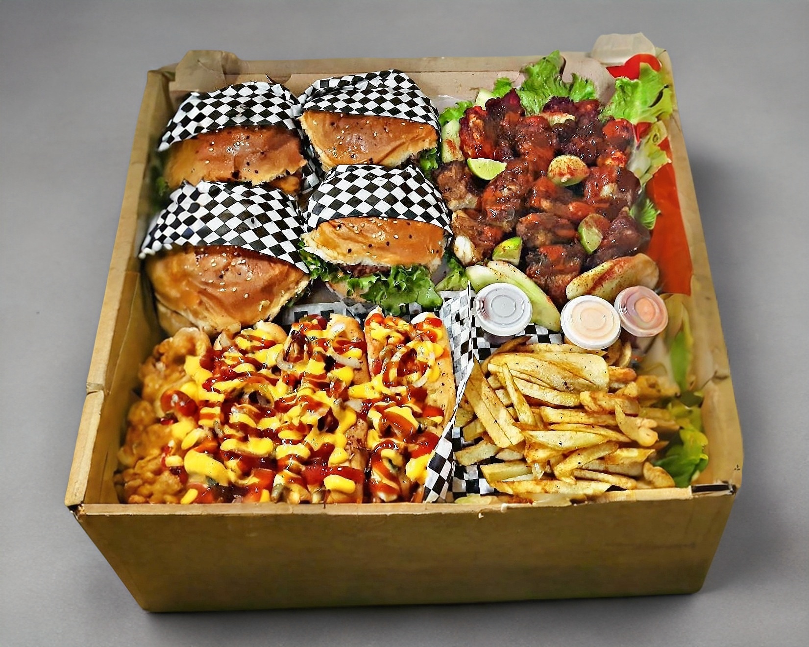 4 Hamburguesas a elegir, 4 hot dogs sencillos, 7 alitas, 7 costillas a la BBQ y papas a la francesa.