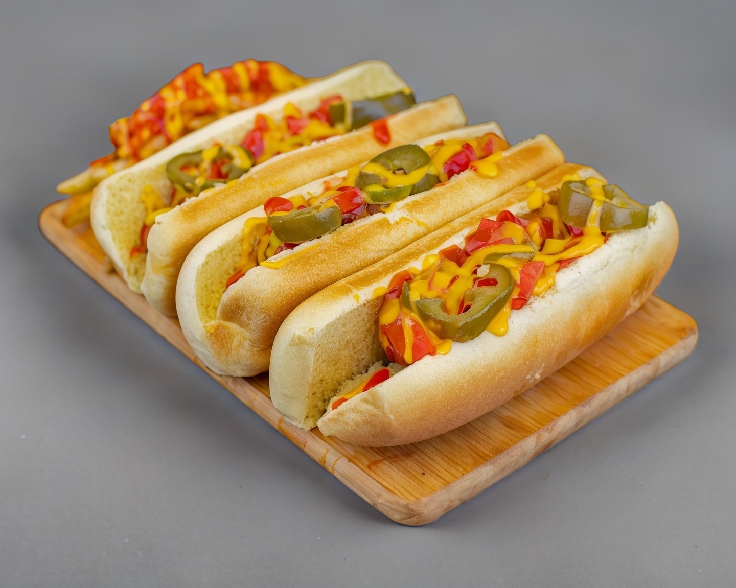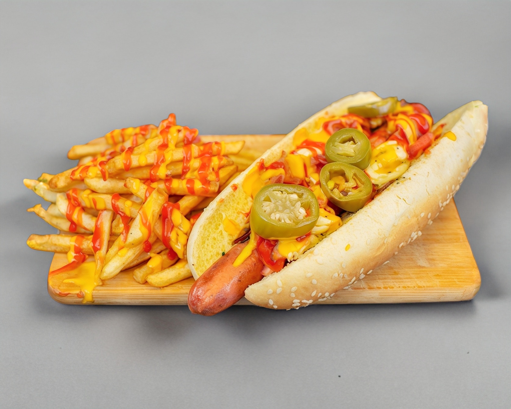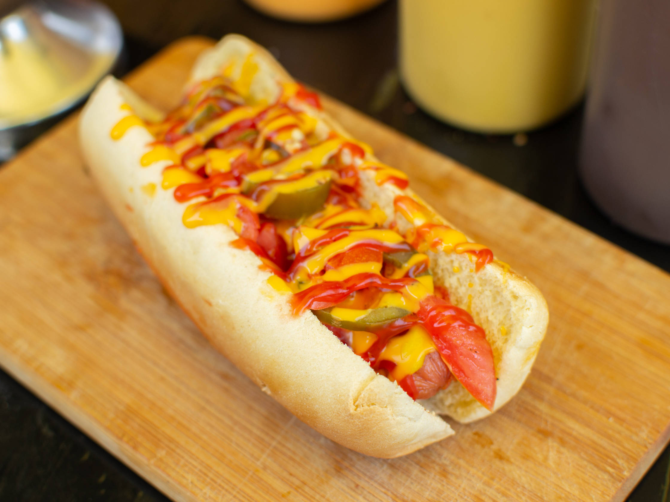 Mayonesa, cátsup, mostaza, queso amarillo líquido, jitomate, cebolla caramelizada, rajitas.
