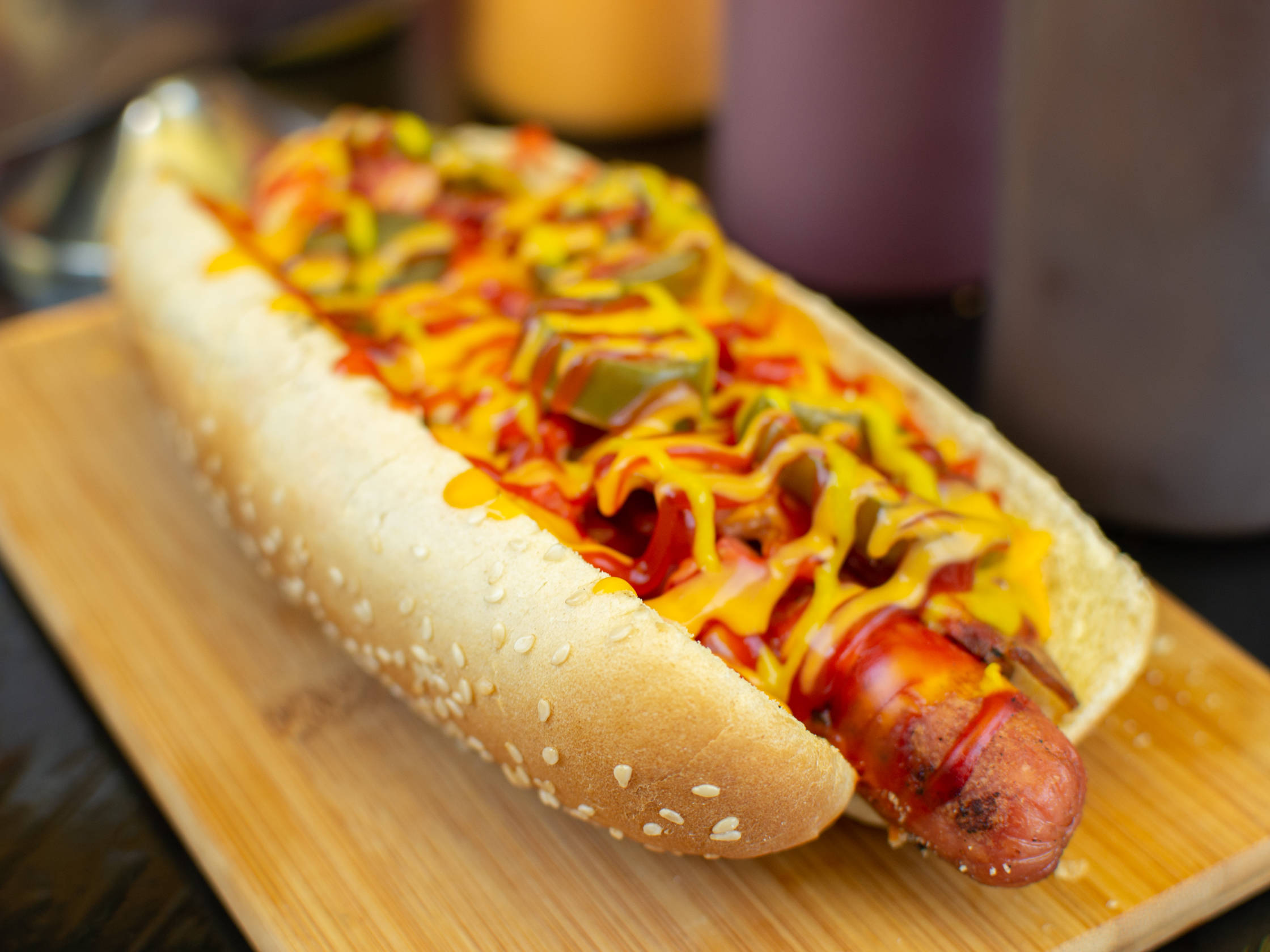 Tocino, queso manchego, mayonesa, cátsup, mostaza, queso amarillo líquido, jitomate, cebolla caramelizada, rajitas.