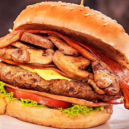 Carne de res casera, champiñones, queso manchego, tocino, mayonesa, cátsup, mostaza, queso amarillo líquido, lechuga, jitomate, cebolla caramelizada, rajitas.