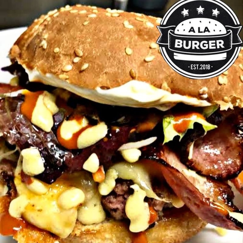 Doble carne de res casera, una carne de pollo, jamón, tocino, salchicha, huevo frito, salsa BBQ, manchego, mayonesa, cátsup, mostaza, queso amarillo líquido, lechuga, jitomate, cebolla caramelizada, rajitas.