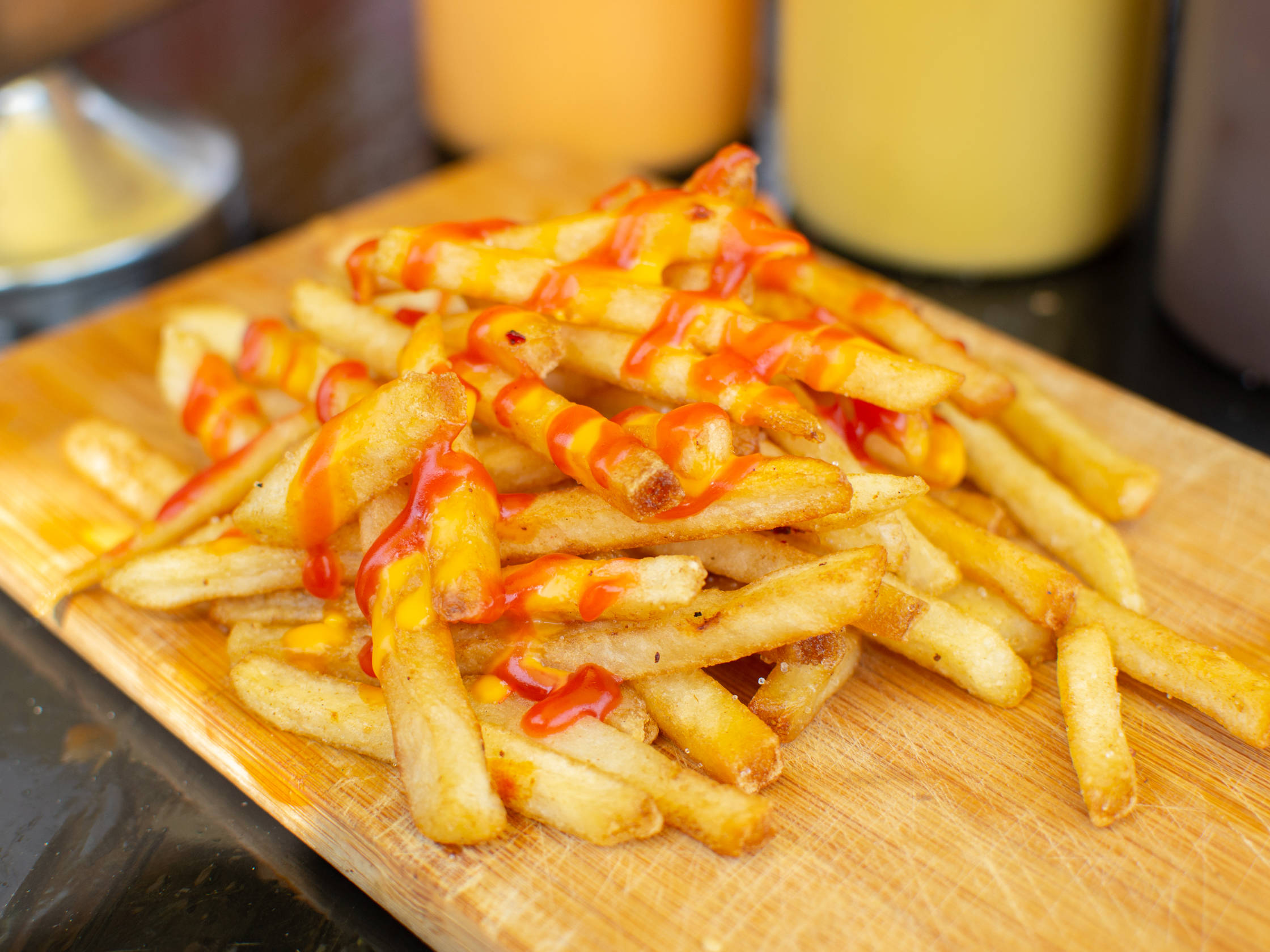 400 g De papas a la francesa naturales, con queso amarillo líquido y cátsup.