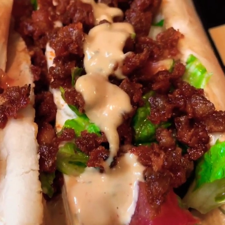 Pan brioche con doble carne de res casera, jamón, tocino, queso manchego, salchicha, BBQ, mayonesa, cátsup, mostaza, queso amarillo líquido, lechuga, jitomate, cebolla caramelizada y rajitas.