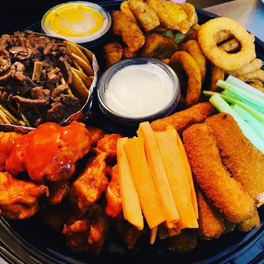 6 Costillas 6 alitas a la BBQ, 6 dedos de queso, 6 boneless, 6 aros de cebolla y papas a la francesa.