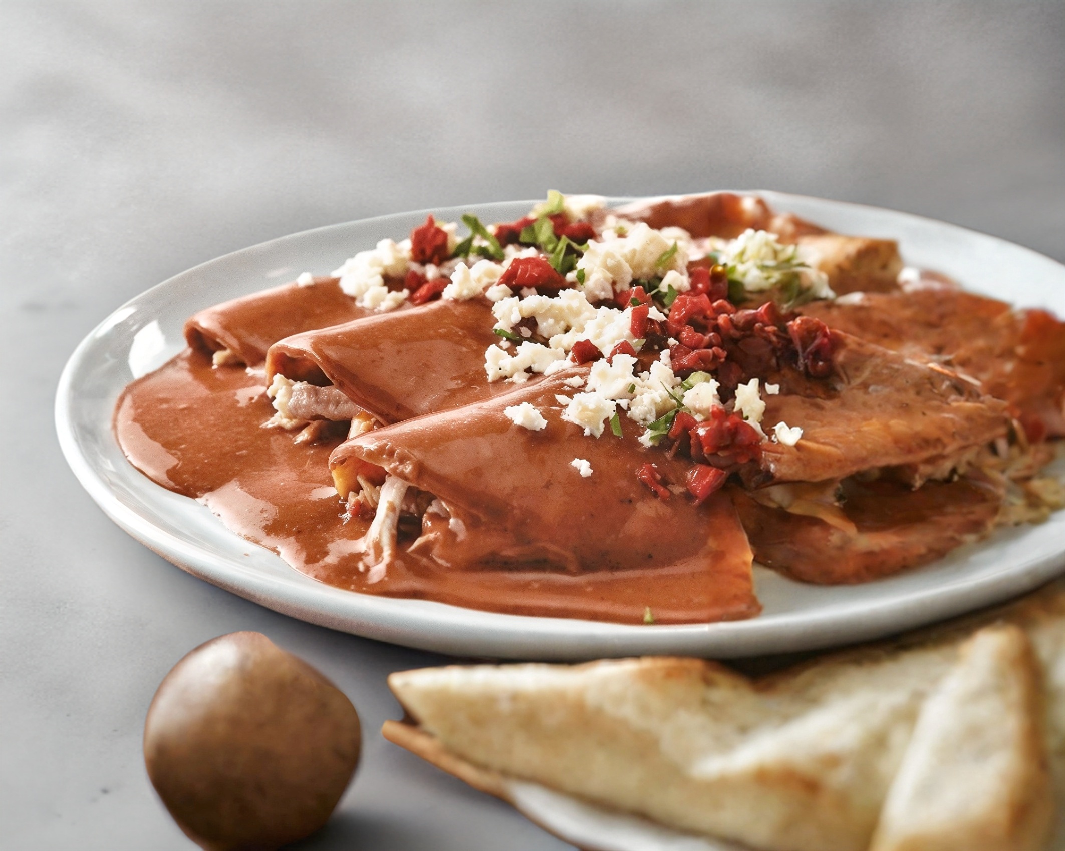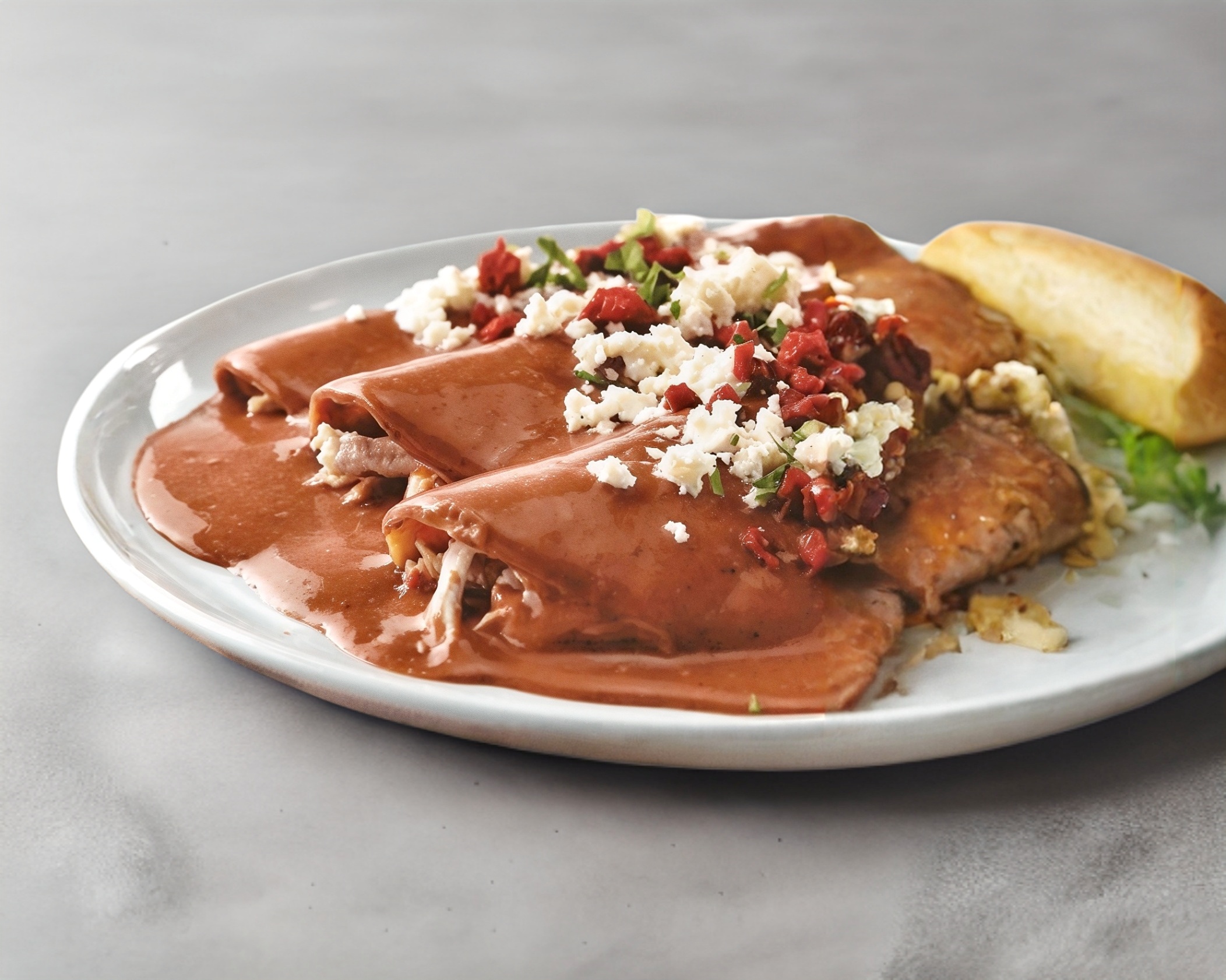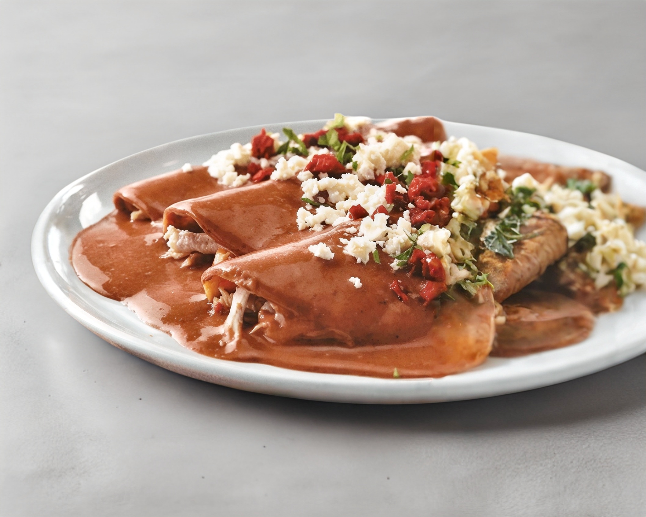 Incluye café de olla o más extra cámbialo por jugo de naranja. Tortillas de maíz, bañados con mole rojo, cebolla y queso rallado panela.