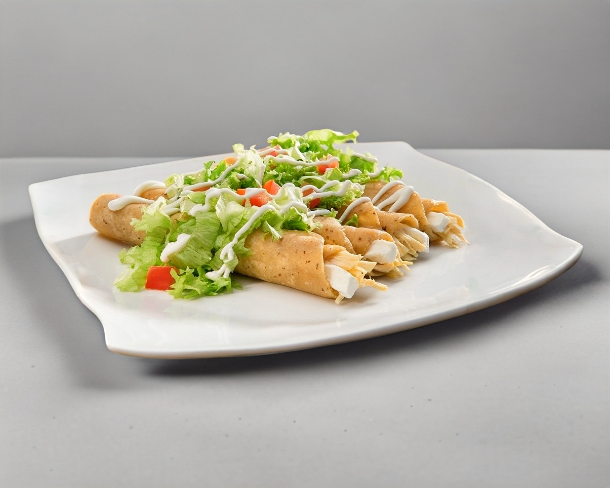 Deliciosos tacos dorados (4 piezas) acompañados de lechuga, queso y crema, los puedes elegir de pollo o papa. Incluye complementos extras (Sopa del día, arroz, tortilla), a elección 2.