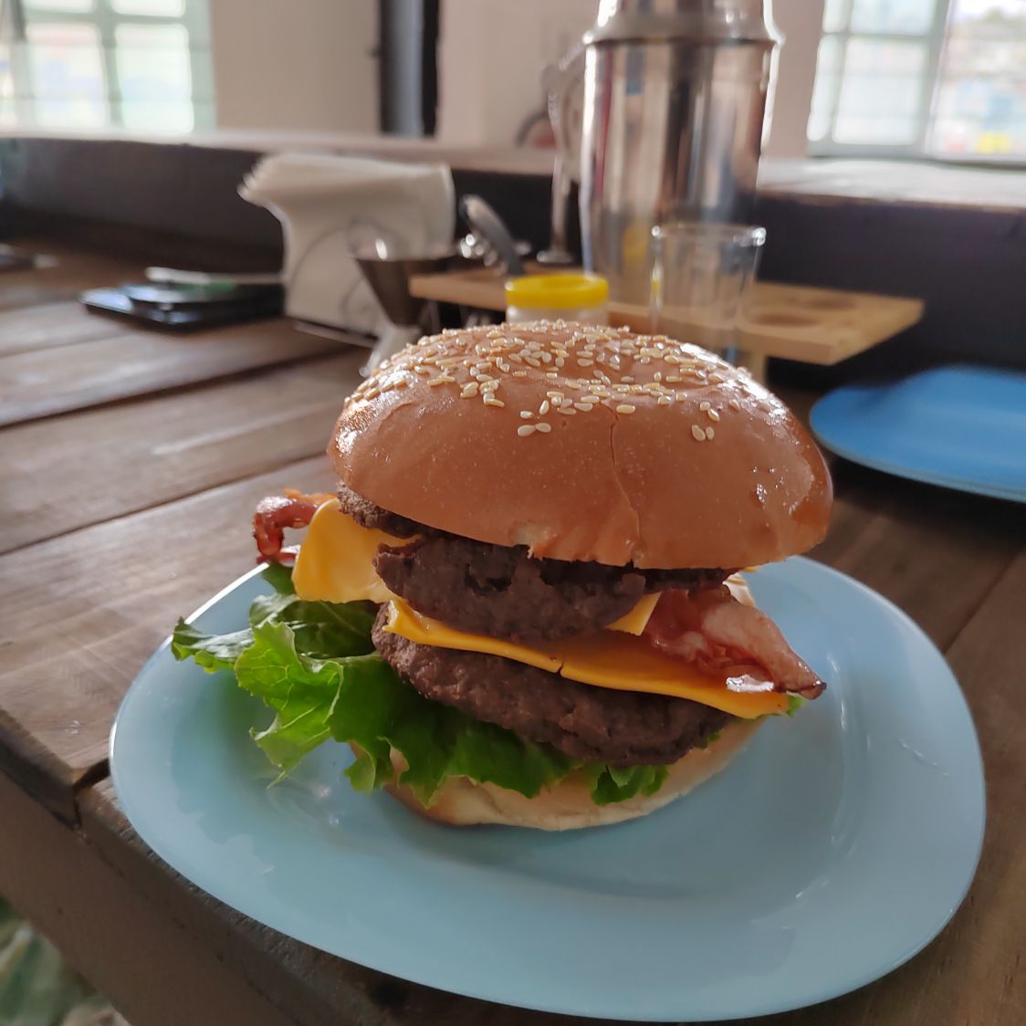 Exquisita hamburguesa con doble carne queso y tocino. Servidas con lechuga, jitomate, cebolla, pepinillos y rajas.