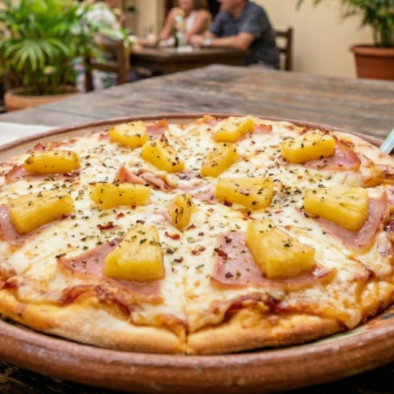 Nuestra Pizza Hawaiana es el balance perfecto entre lo salado y lo dulce, horneada hasta que los bordes quedan doraditos y crujientes.
