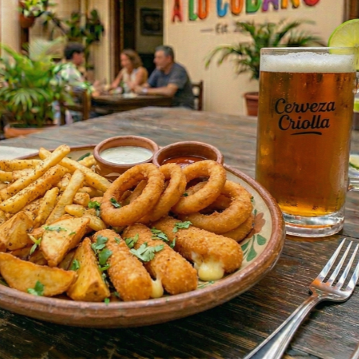 Papas a la francesa, gajo, aros de cebolla y dedos de queso.