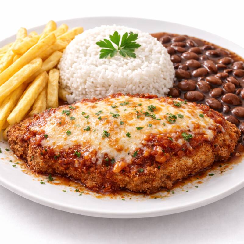 El mejor corte de carne, parmesana, servido con arroz blanco, papas fritas y frijoles.