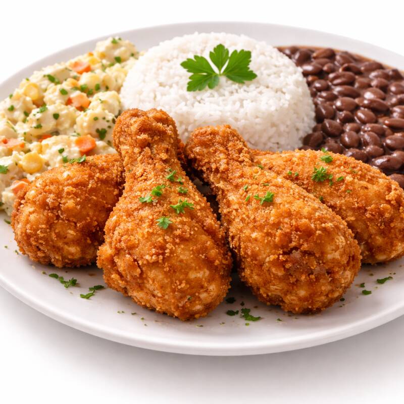 ¡Delicioso pollo frito, servido con ensalada de mayonesa y arroz blanco! ¡Disfruta de este plato típicamente brasileño!
