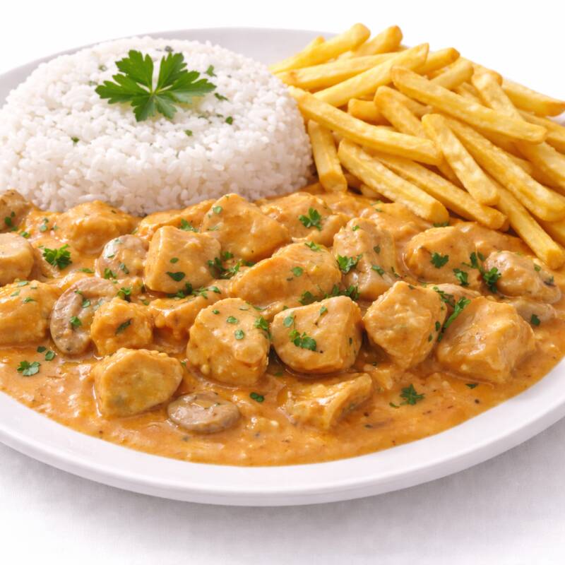 Delicioso stroganoff de pollo, elaborado con crema espesa, leche entera y algunos ingredientes de la receta de la abuela, servido con arroz blanco y papas fritas.