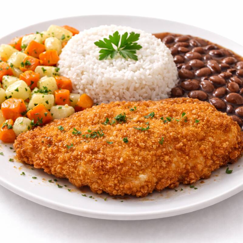 Delicioso pollo empanizado, servido con frijoles, arroz blanco y verduras.