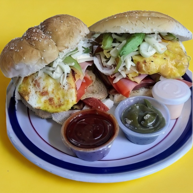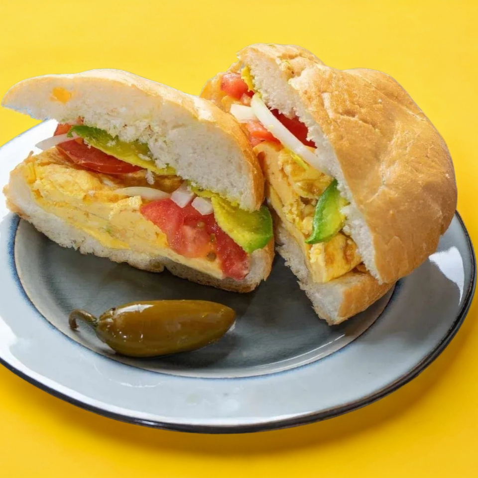 2 tortas con huevos revueltos con quesillo tiene frijoles jitomate mayonesa jitomate aguacate cebolla y picante aparte