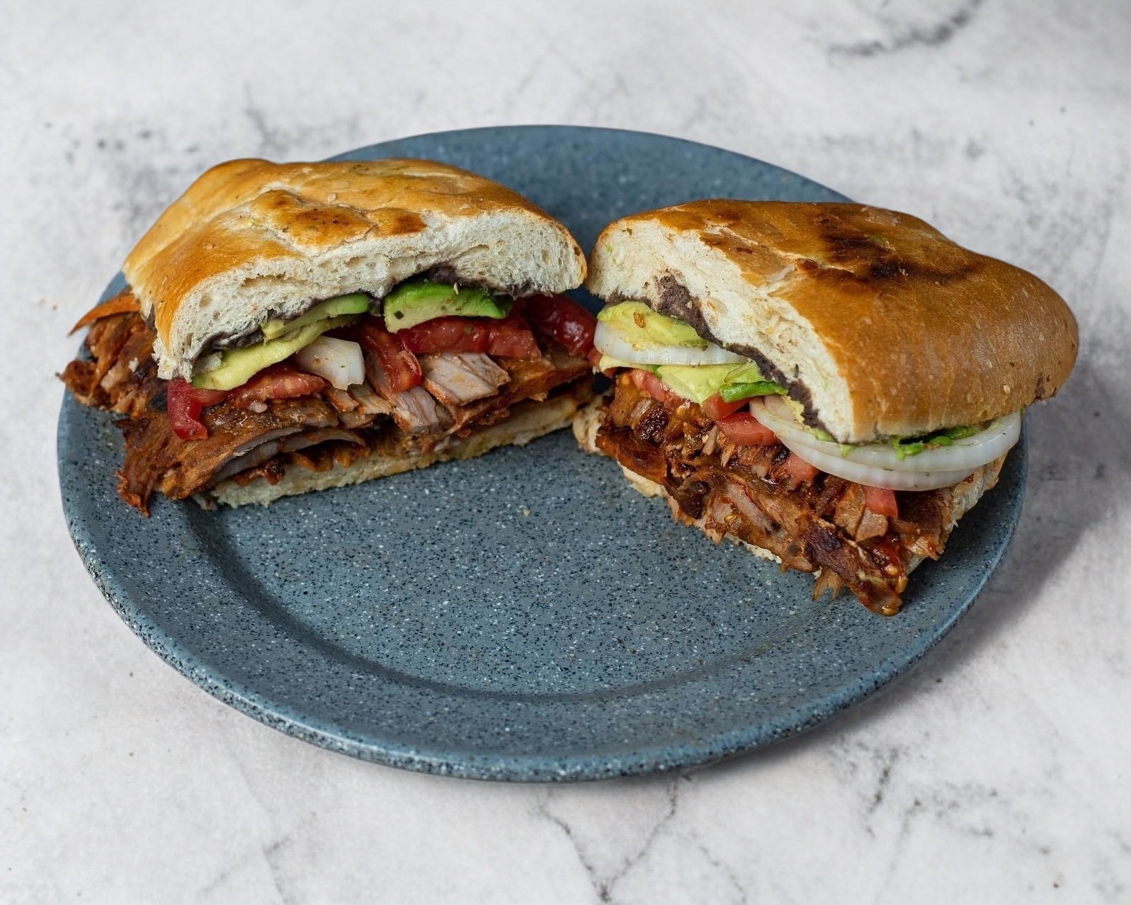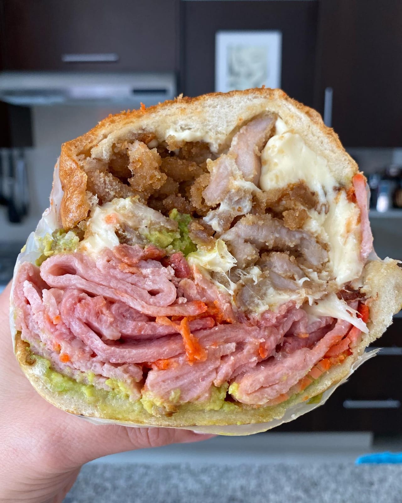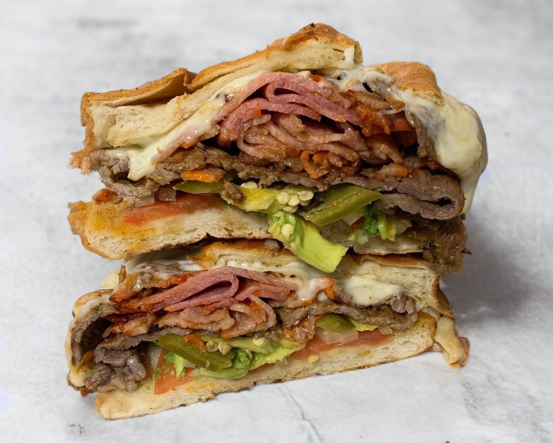 Milanesa de res, pierna española adobada, jamón de pavo cerdo, salchicha de pavo, longaniza, huevo, queso Oaxaca, queso amarillo, vegetales, aderezada con frijoles y mayonesa.