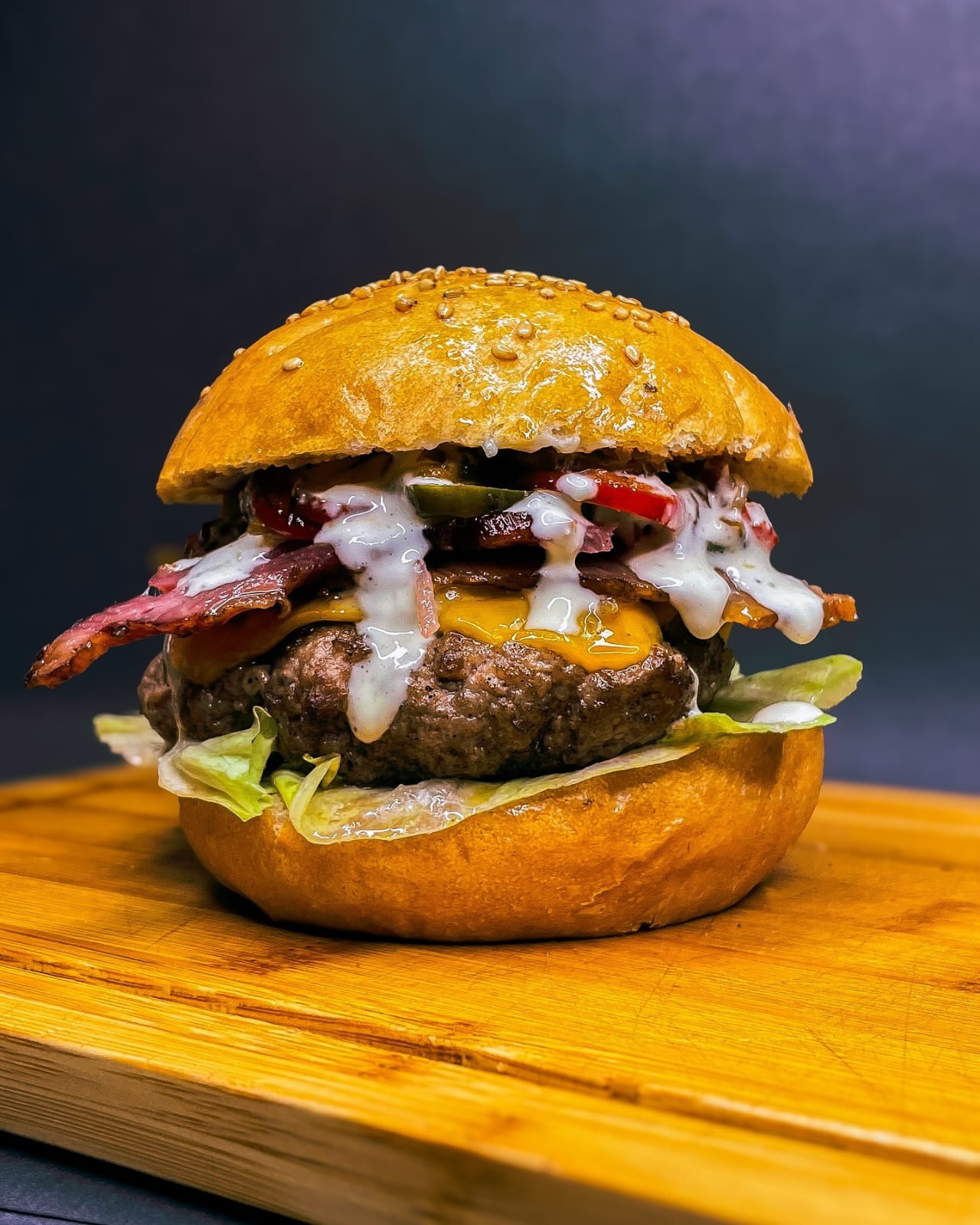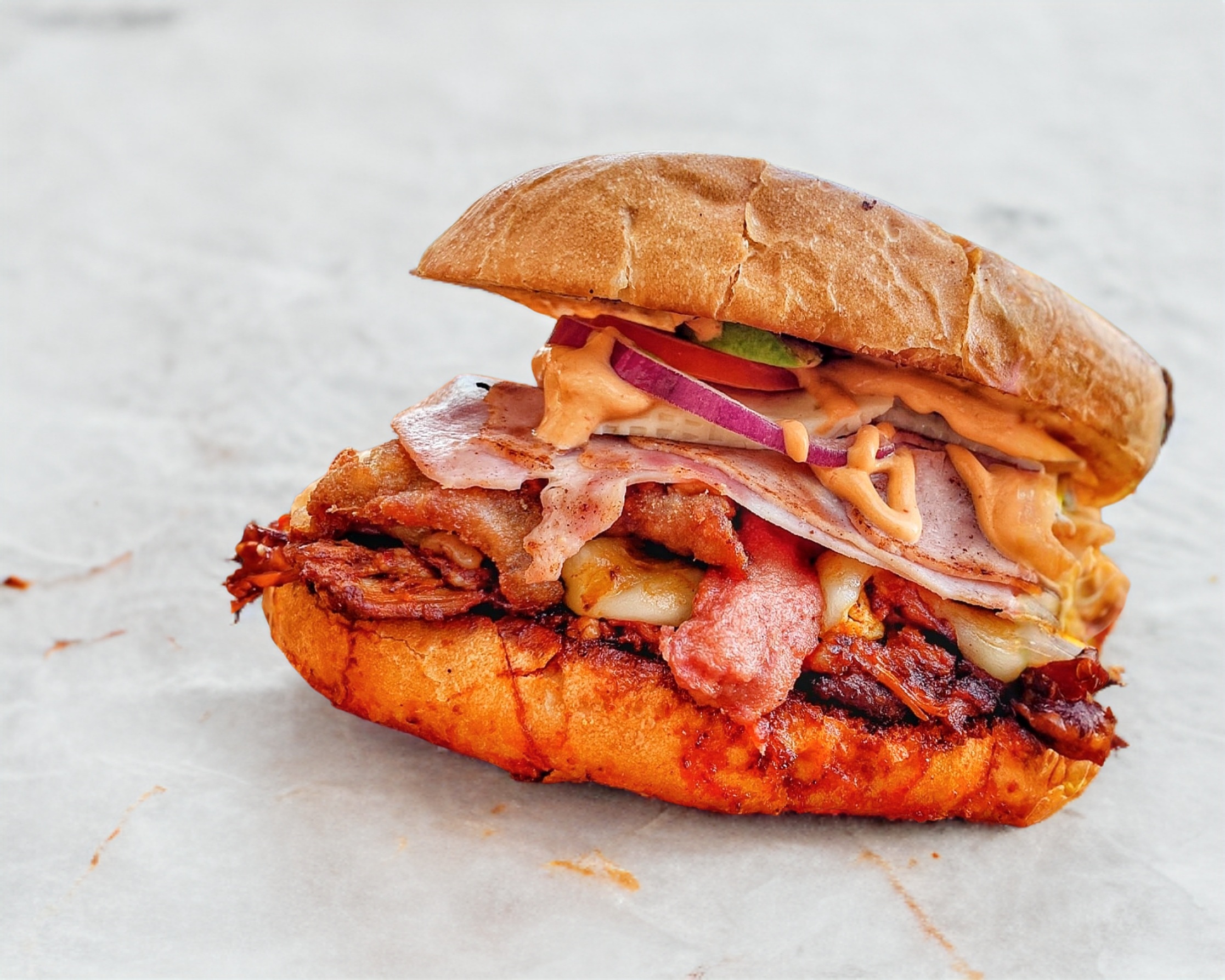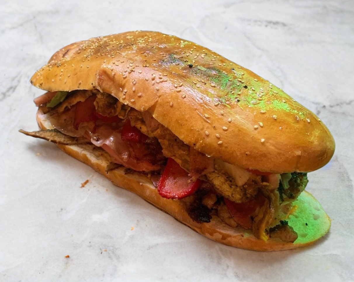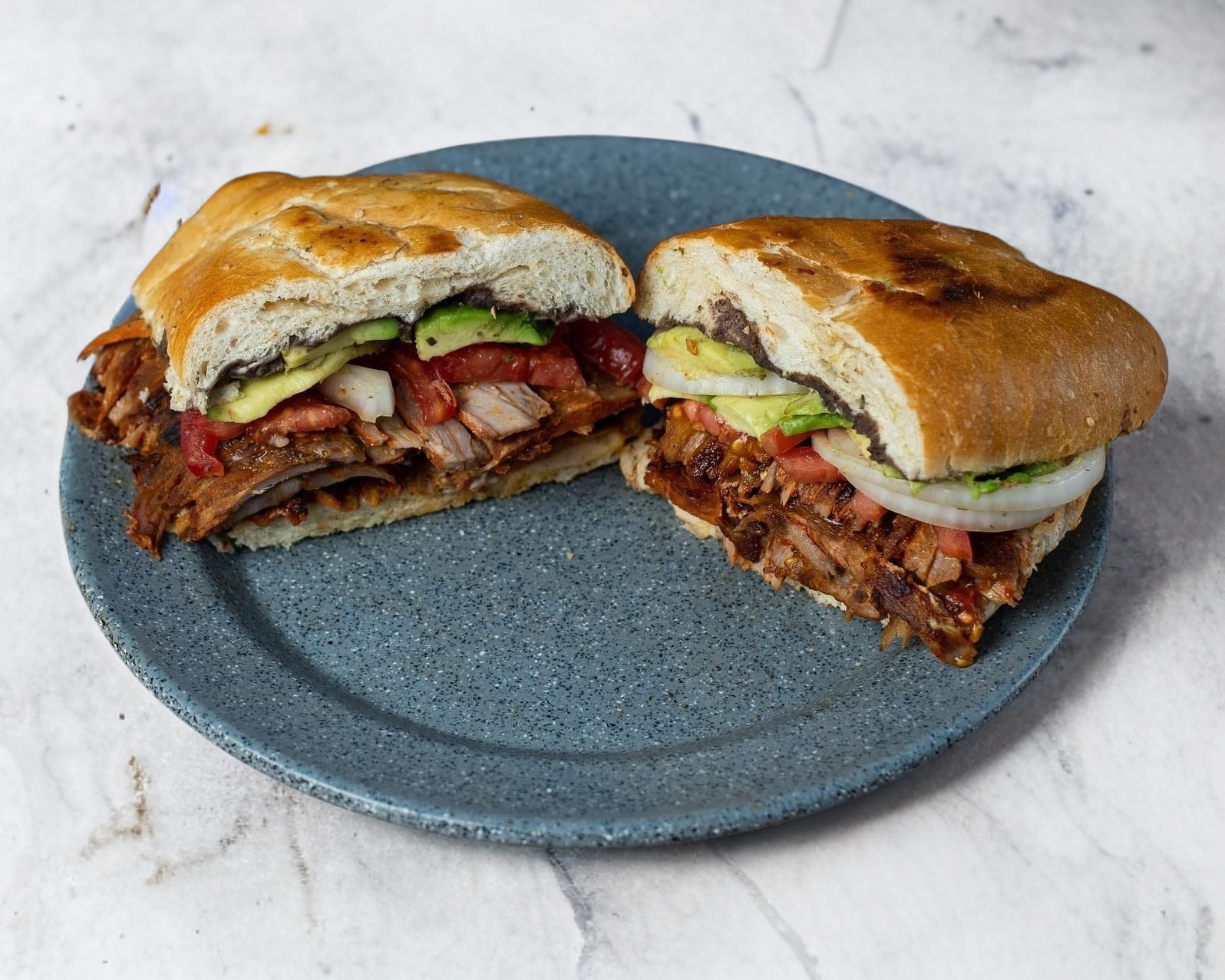 Milanesa de res, pierna española adobada, jamón de pavo cerdo, salchicha de pavo, longaniza, huevo, queso Oaxaca, queso amarillo, vegetales, aderezada con frijoles y mayonesa.