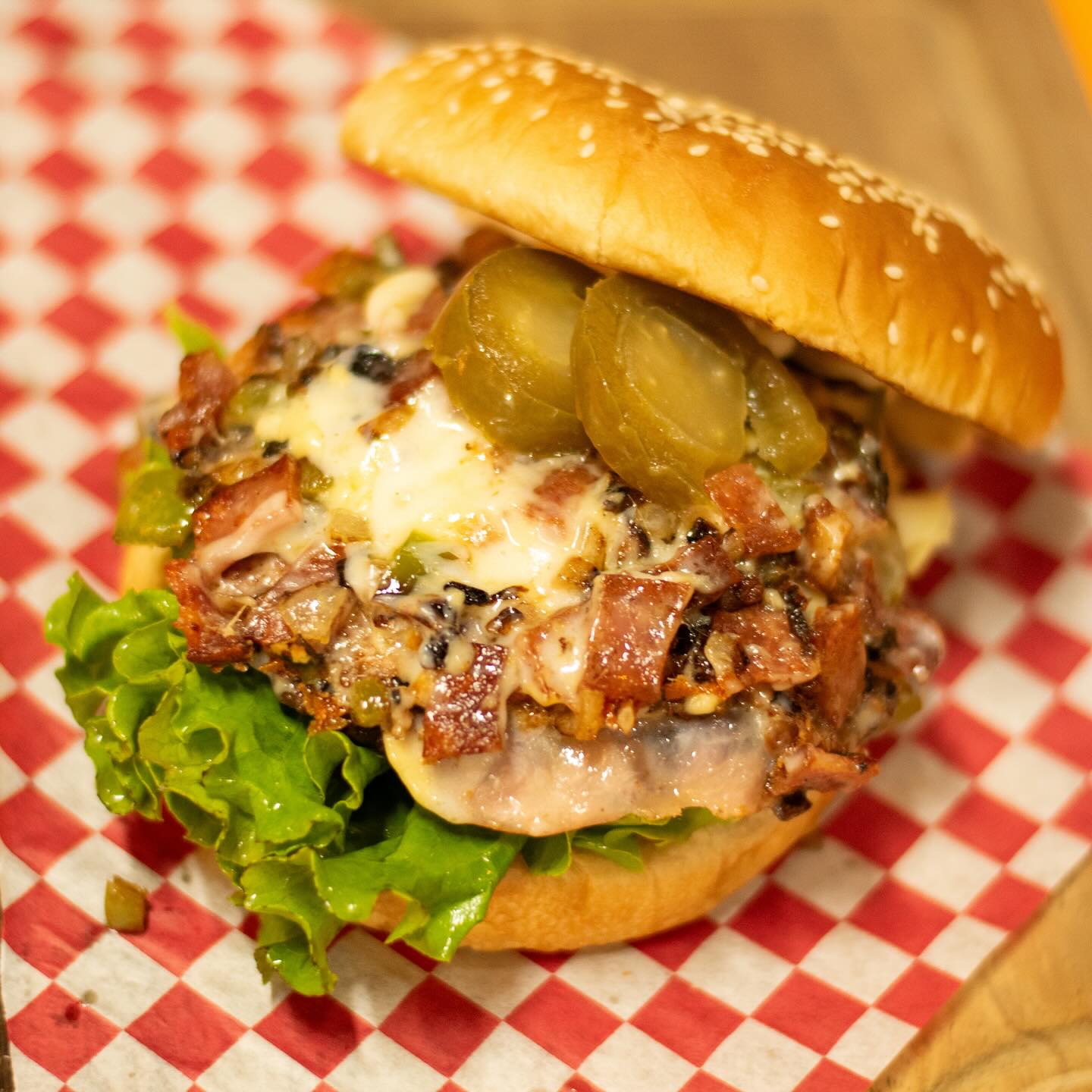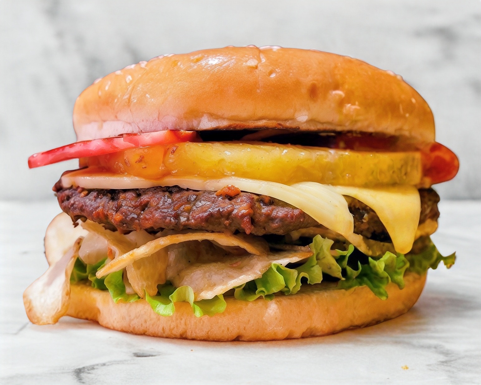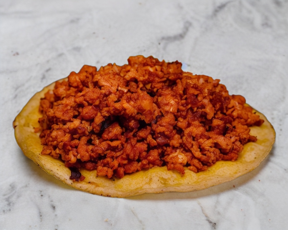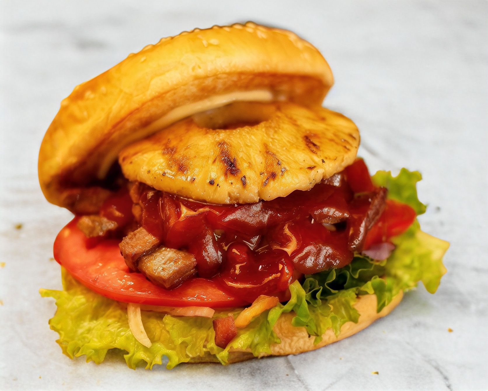 Milanesa de res, piña asada, queso Oaxaca, vegetales, aderezada con frijoles y mayonesa.