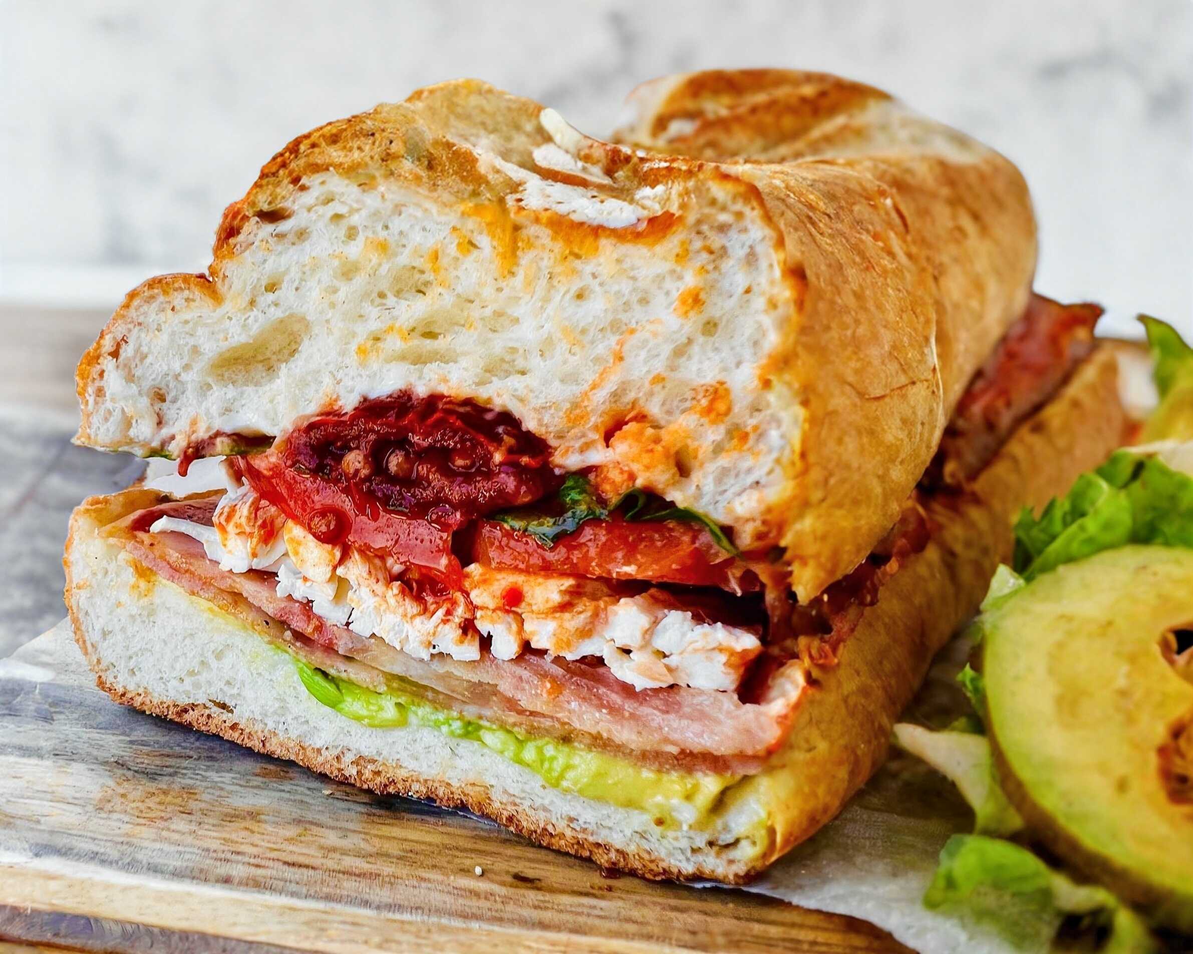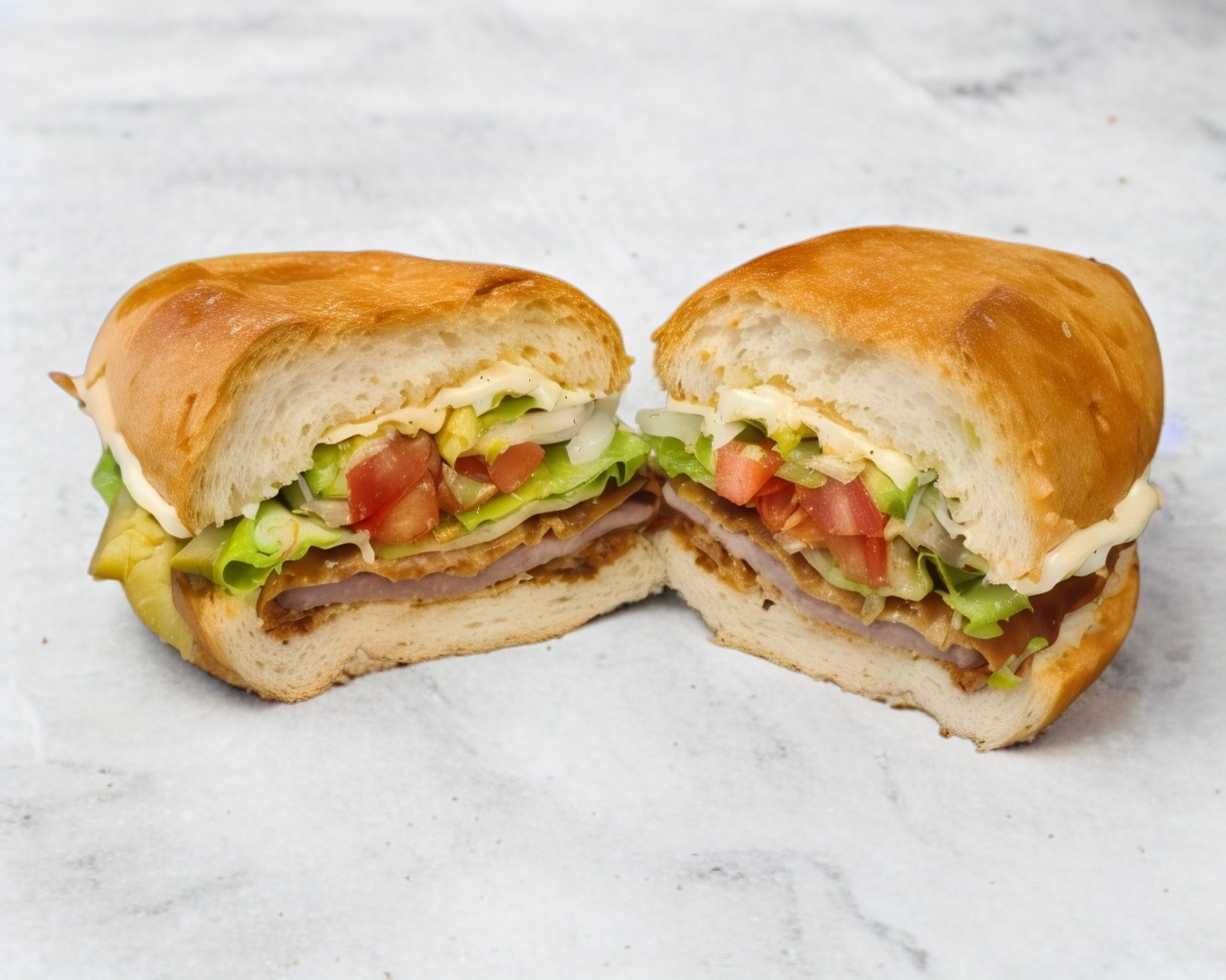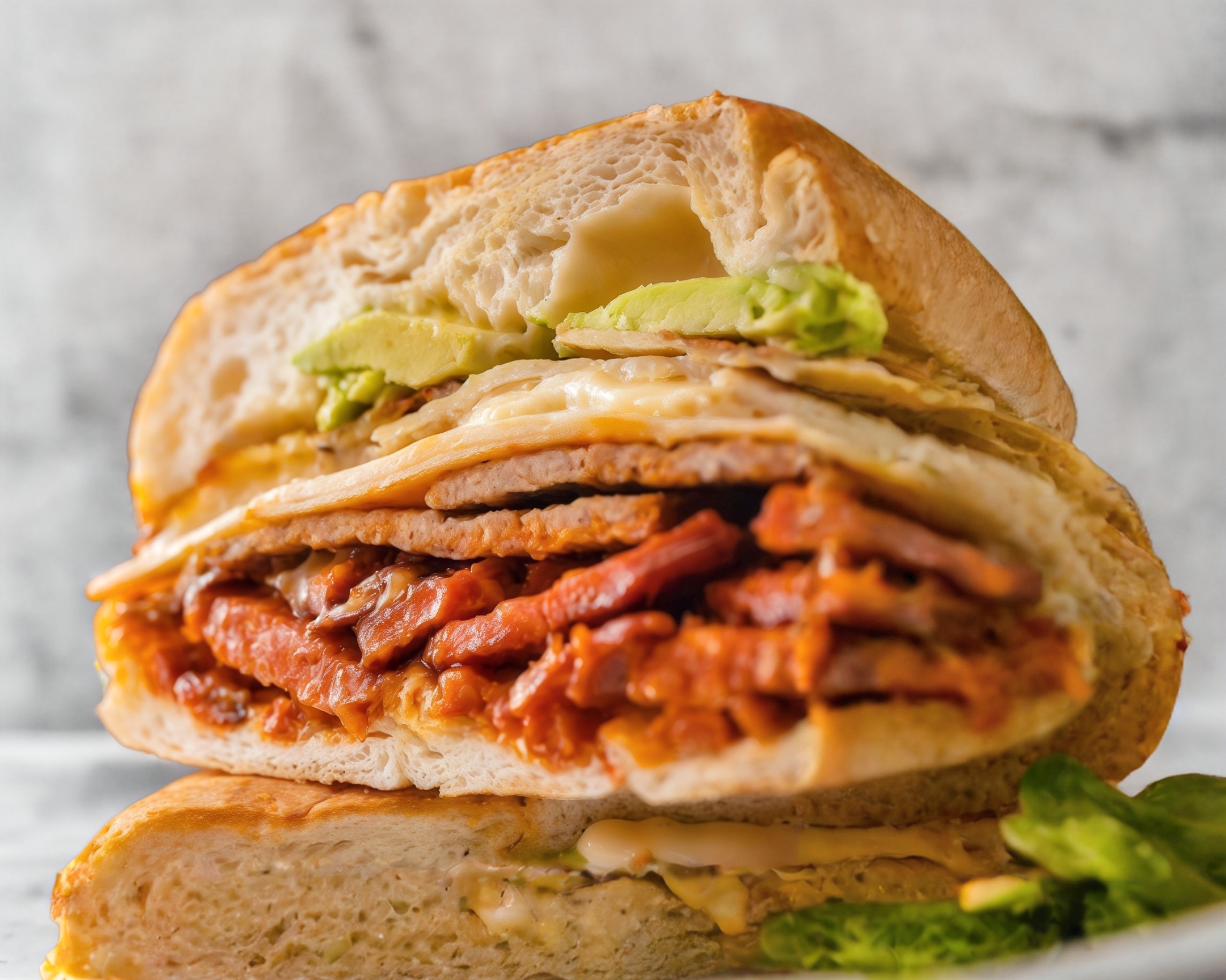 Torta Norteña Preparada con: Milanesa de Res, Pierna española adobada, Queso Oaxaca, Vegetales, Aderezada con Frijoles y Mayonesa.