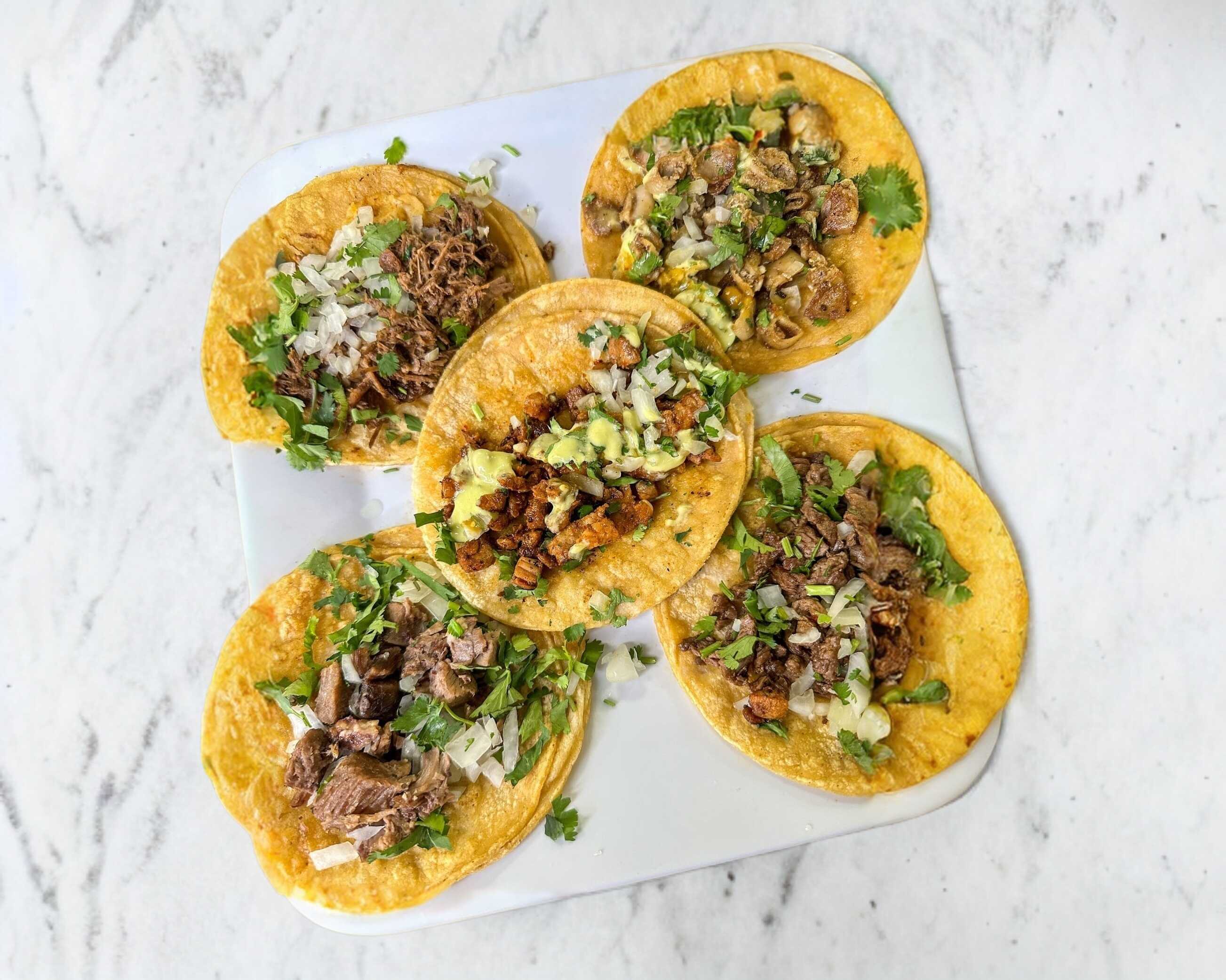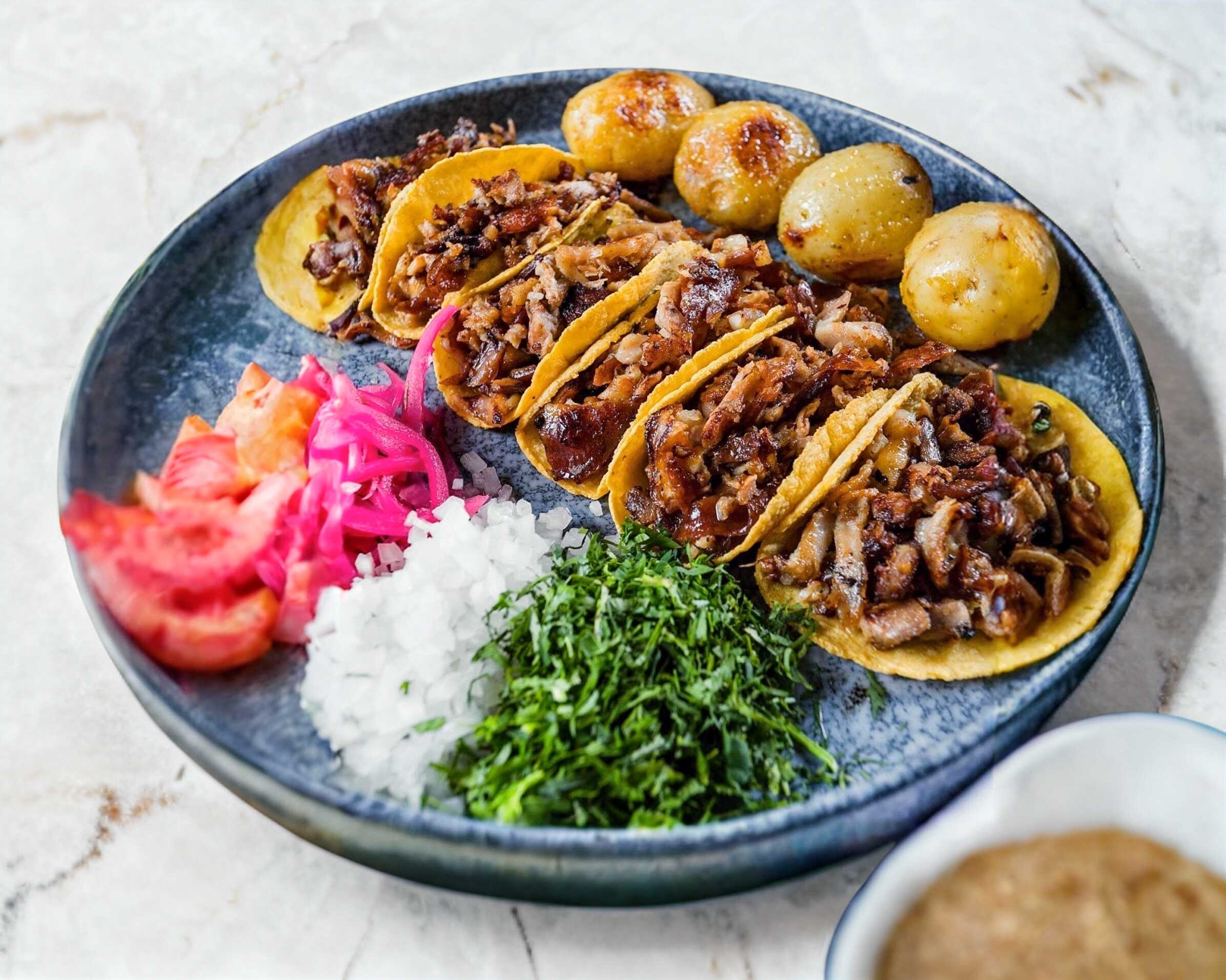 Tacos de carne, en tortilla de maíz, acompañado de salsa y verdura.