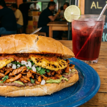 Nuestra legendaria torta con carne al pastor recién salida del trompo, cebollita, cilantro y piña asada en pan artesanal. Acompáñala de una refrescante agua de fruta natural del día. El clásico que nunca falla.