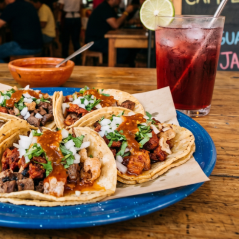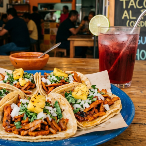 ¡Directo del trompo a tu plato! 5 Tacos al Pastor con su piña, cebollita y cilantro, acompañados de una agua del día bien helada. El sabor clásico que nunca falla cuando el hambre aprieta.