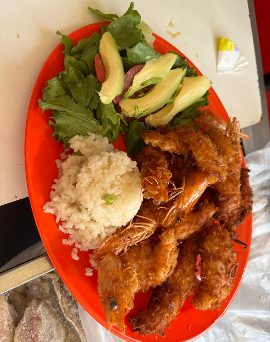 Camarones medianos cubiertos con una capa crujiente de coco rallado, servidos con arroz.