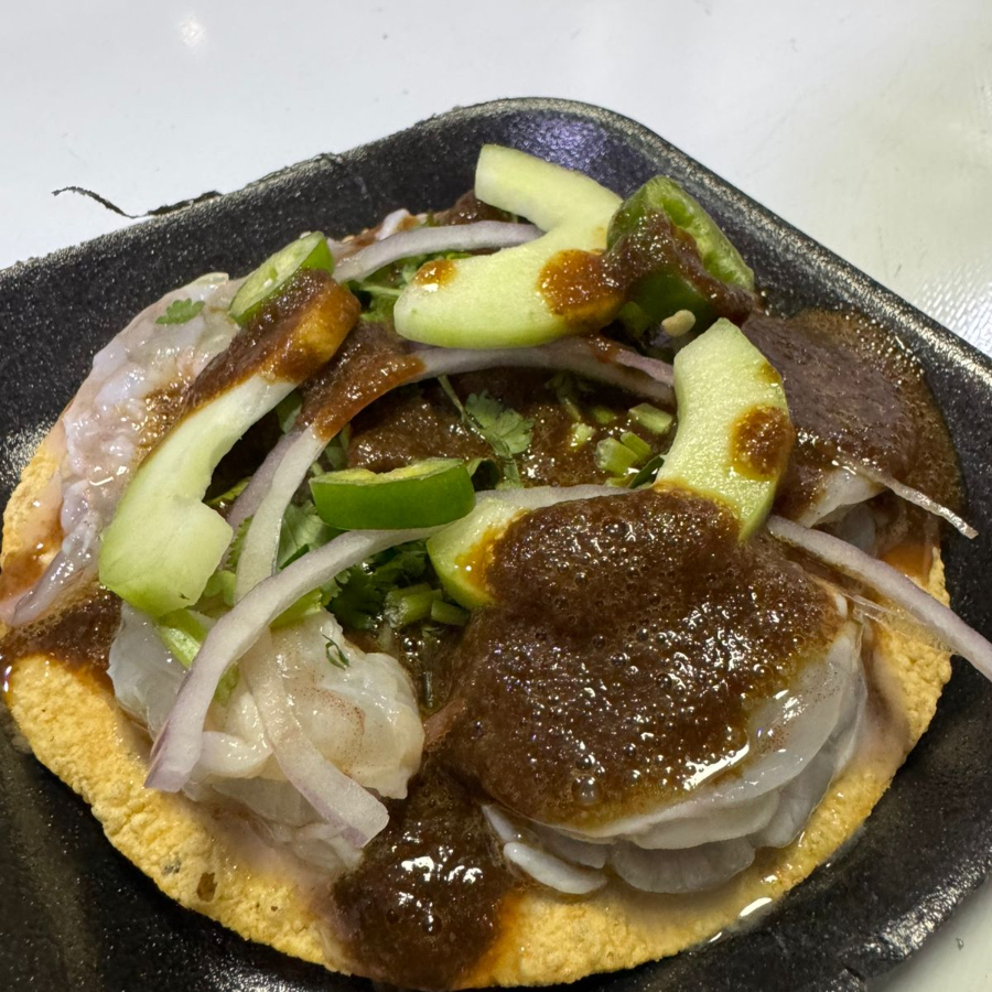 Tostada crujiente servida con nuestra receta especial de aguachile, vegetales frescos y un toque cítrico.
