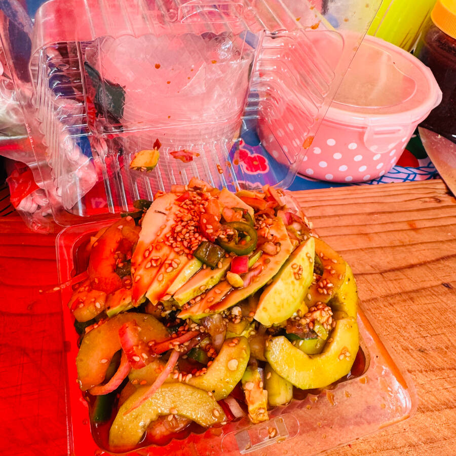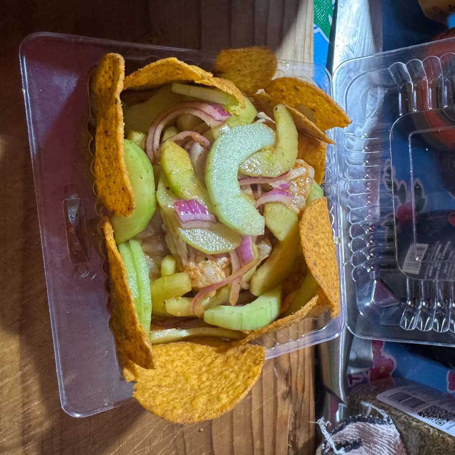 Camaron crudo o cocido, cebolla morada, pepino, salsas a eleccion