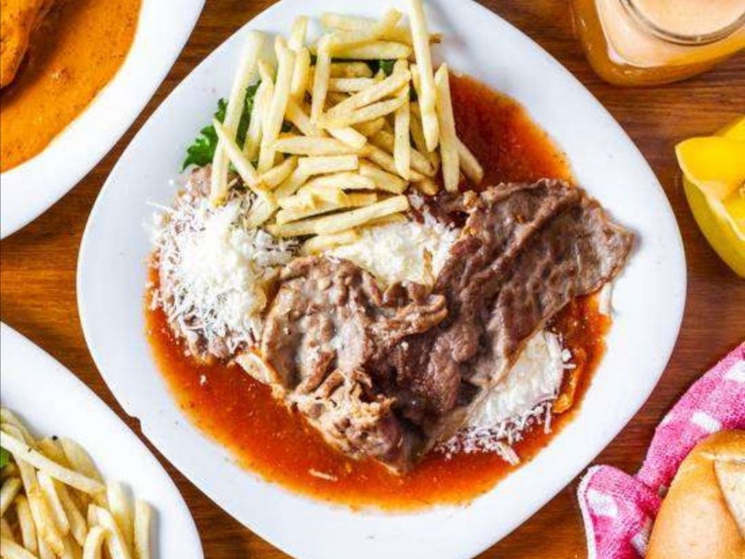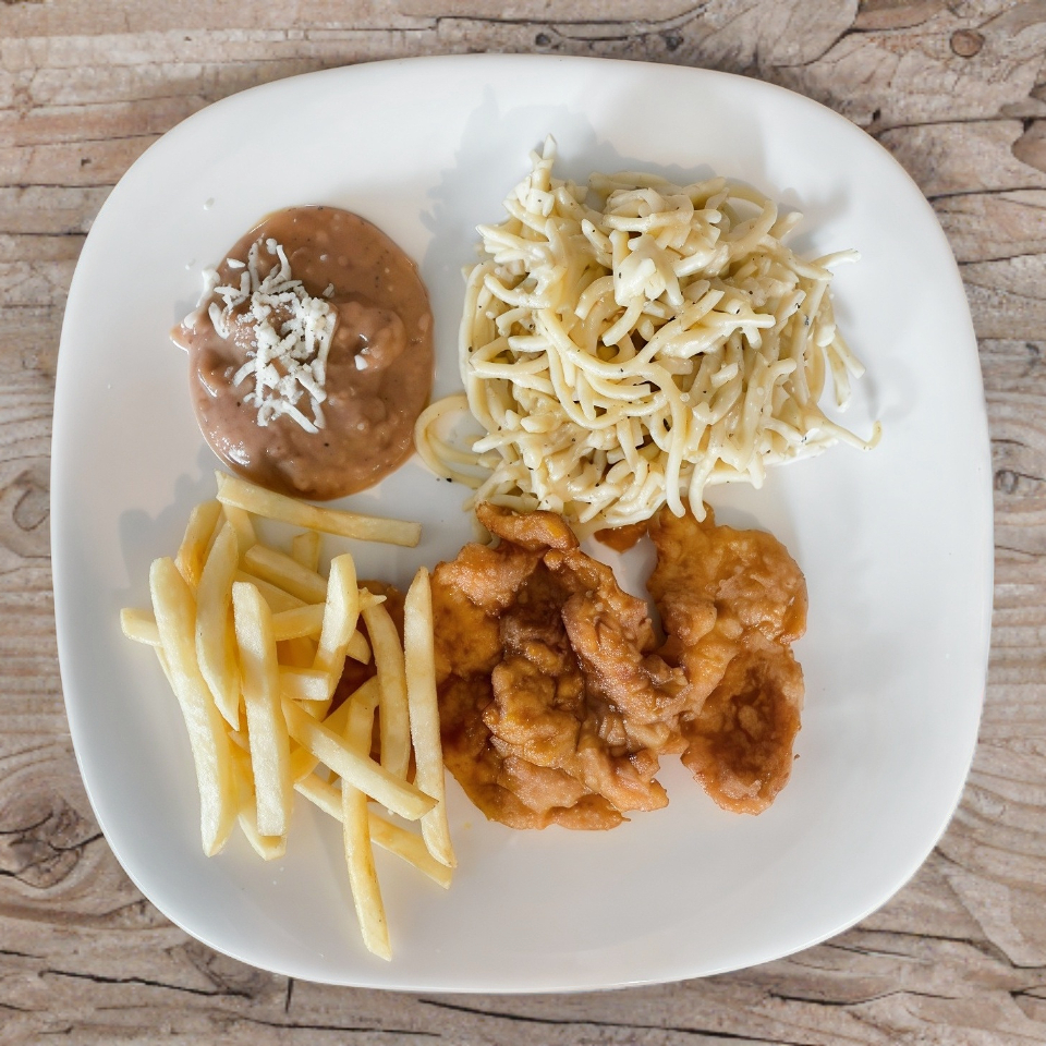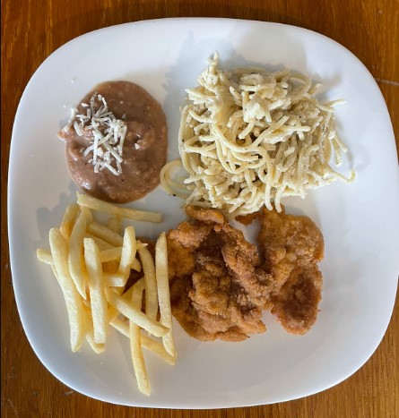 Espagueti acompañado con milanesa de res o pollo y papas a la francesa.