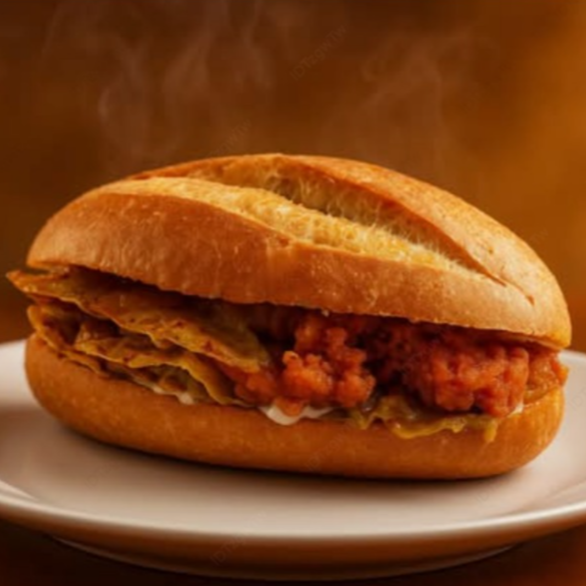 deliciosa y tradicional torta de chilaquiles , verde o roja , con crema y queso rallado , bolillo o baguette